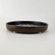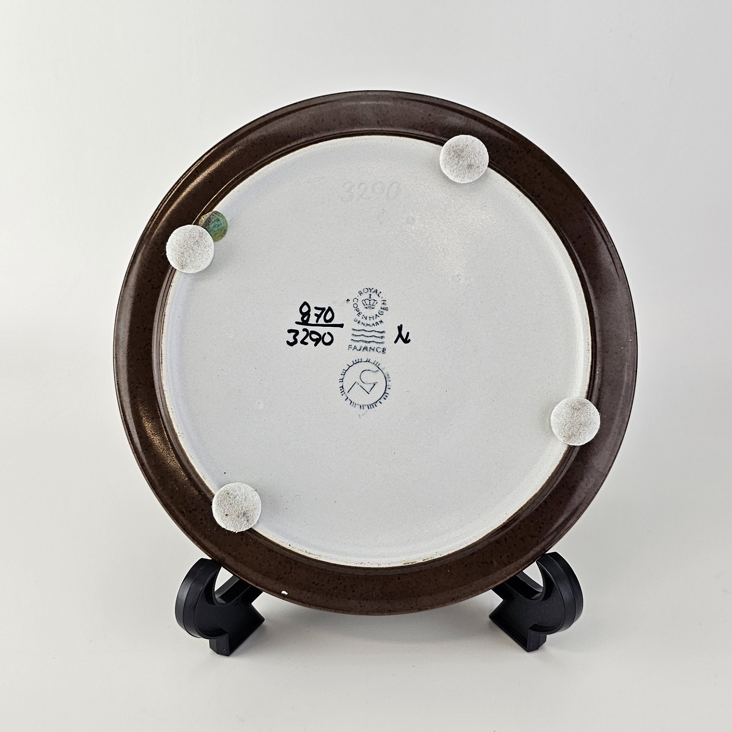 Beskrivelse: Flad rund skål i fajance fra Baca serien med mønster i brune nuancer