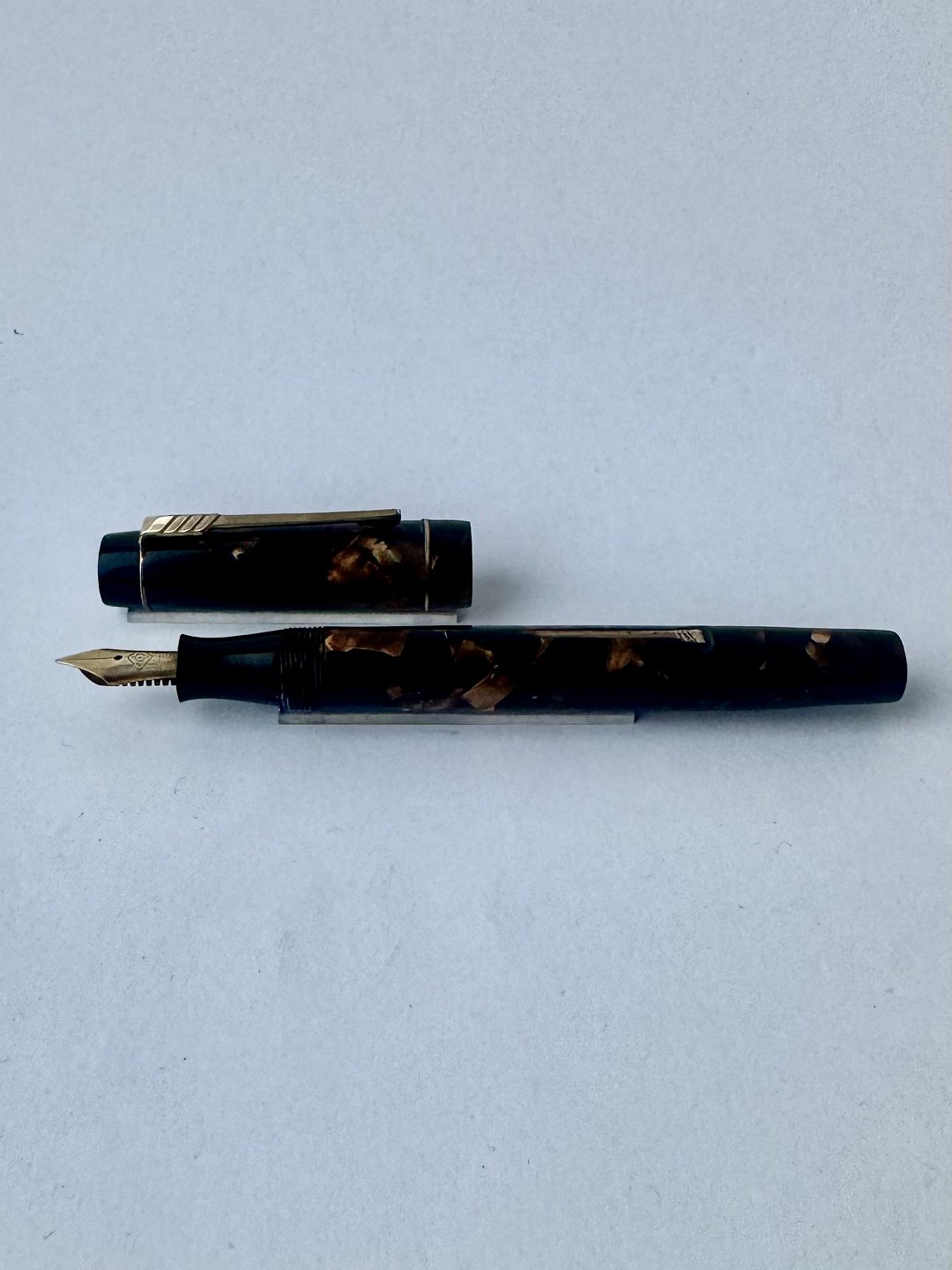 Description: Black and brown marbled Croxley fountain pen. Lever filler ink refill system. New rubber sack must be inserted before the pen can absorb ink and write again. Unoriginal 14 carat gold nib. Length: 12.5 cm