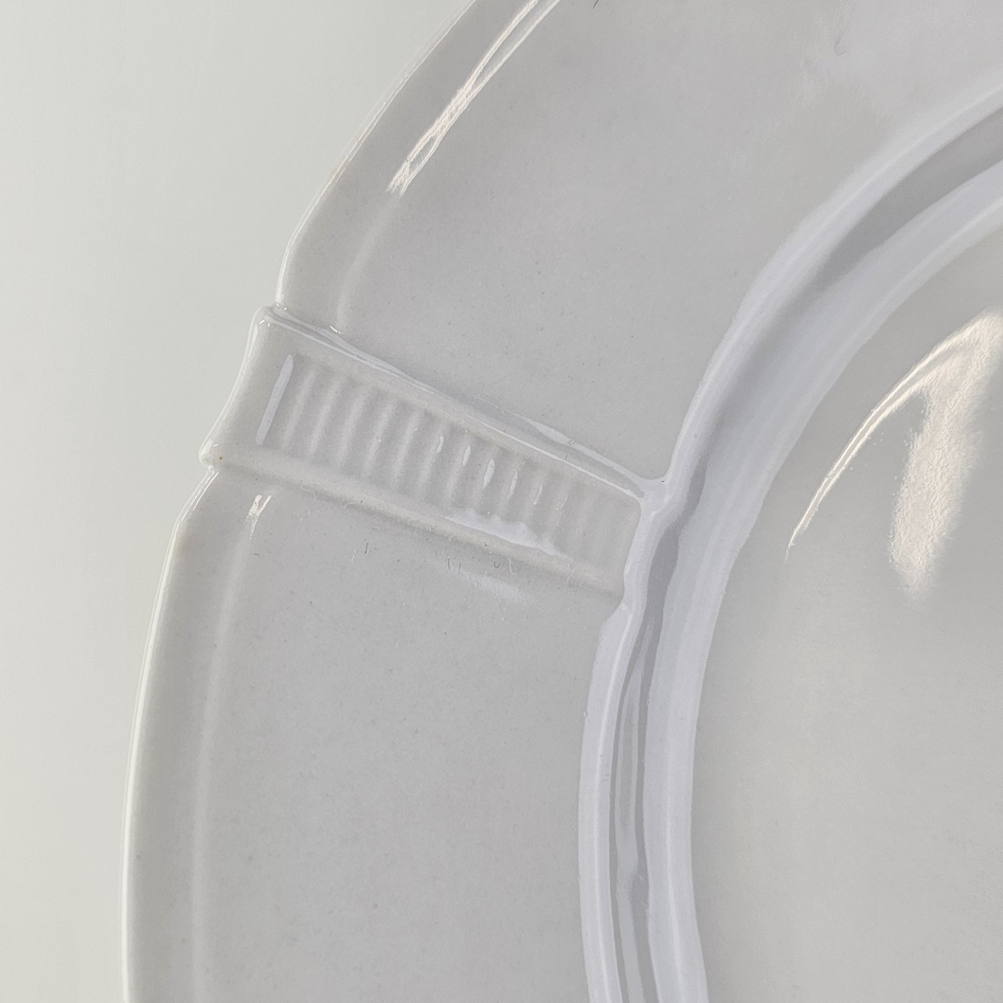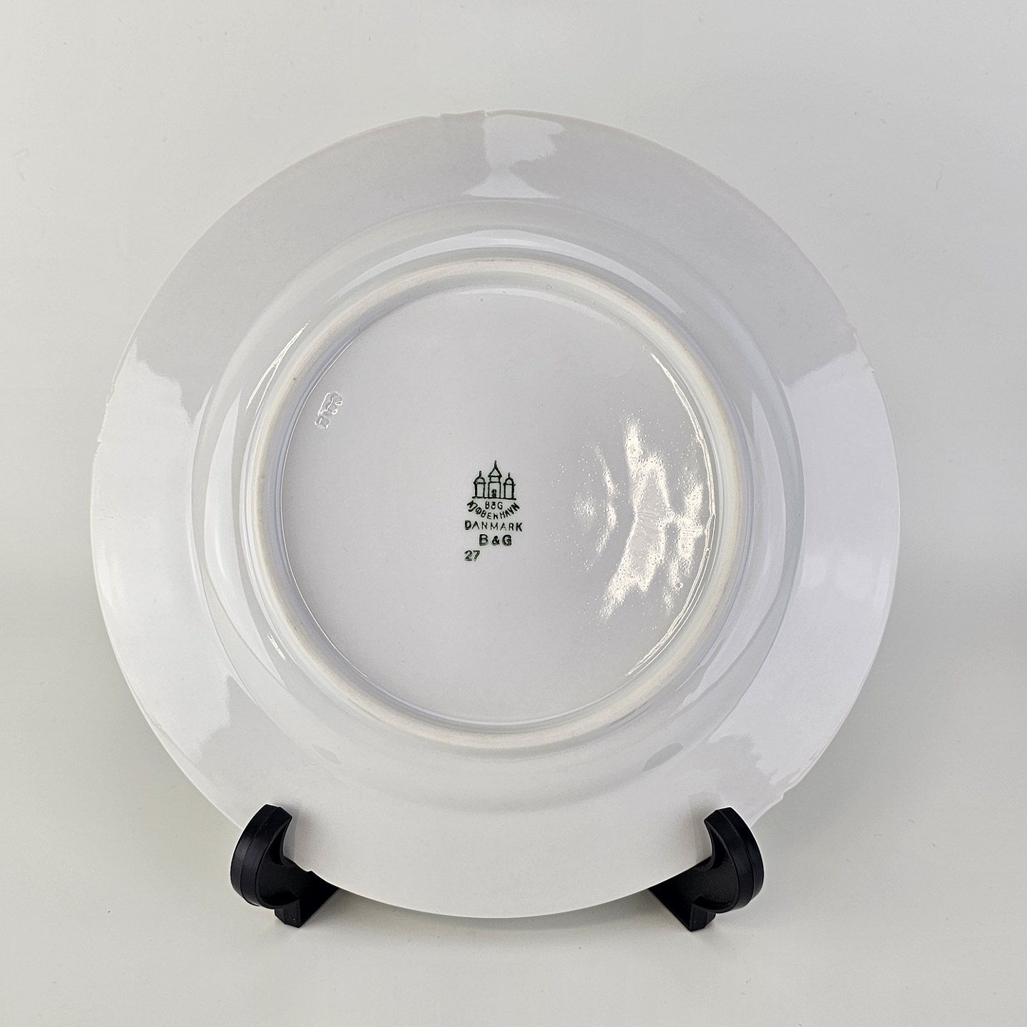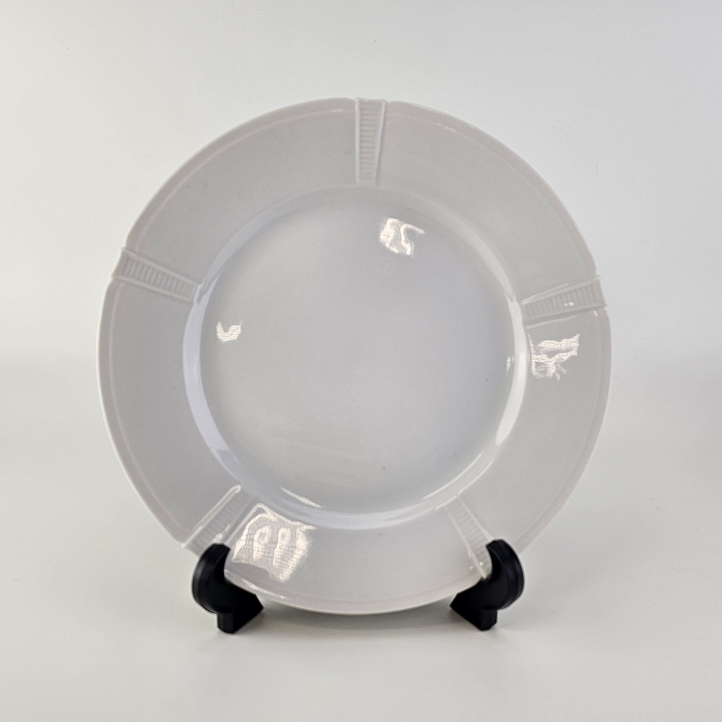 Beskrivelse: Flad frokosttallerken i hvidt porcelæn fra stellet Rosenborg