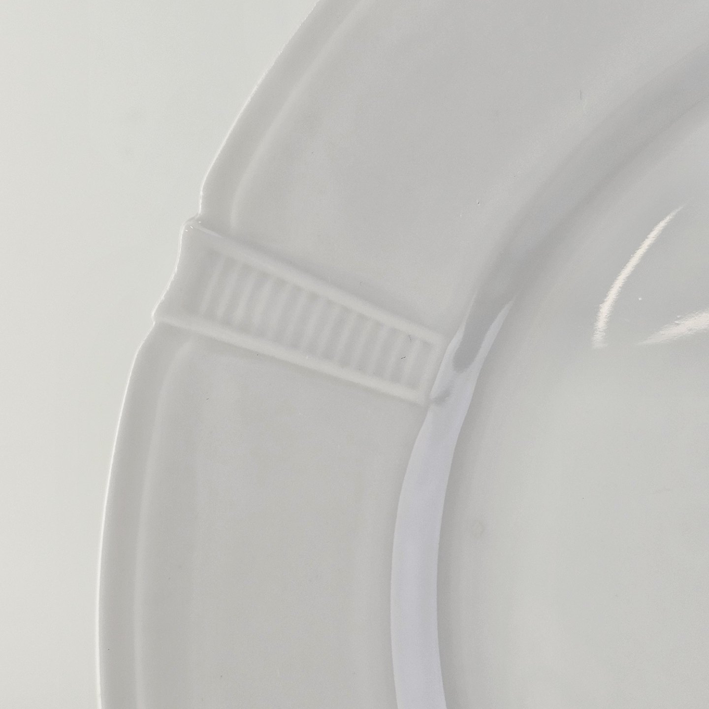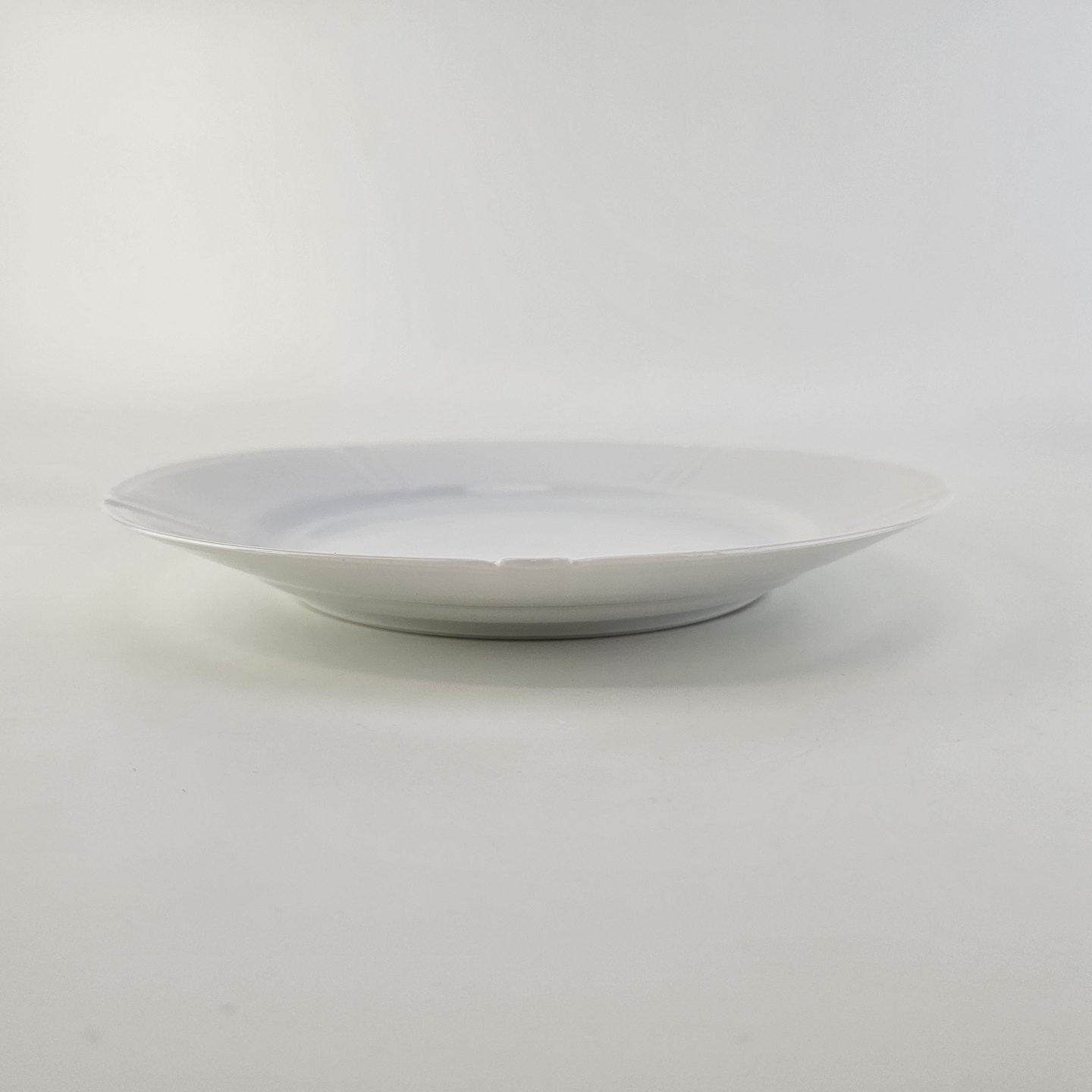 Beskrivelse: Flad frokosttallerken i hvidt porcelæn fra stellet Rosenborg