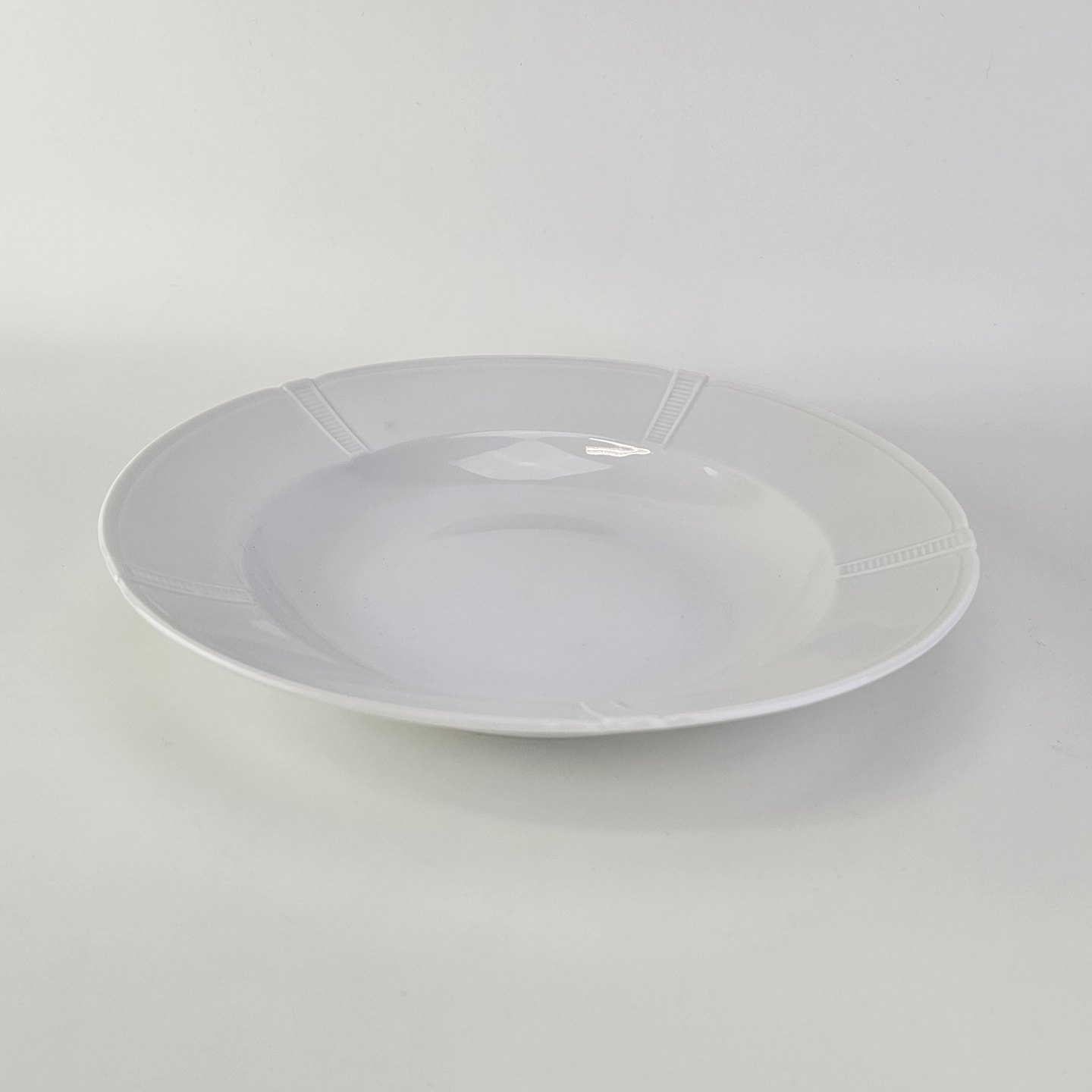 Beskrivelse: Stor dyb tallerken i hvidt porcelæn fra stellet Rosenborg