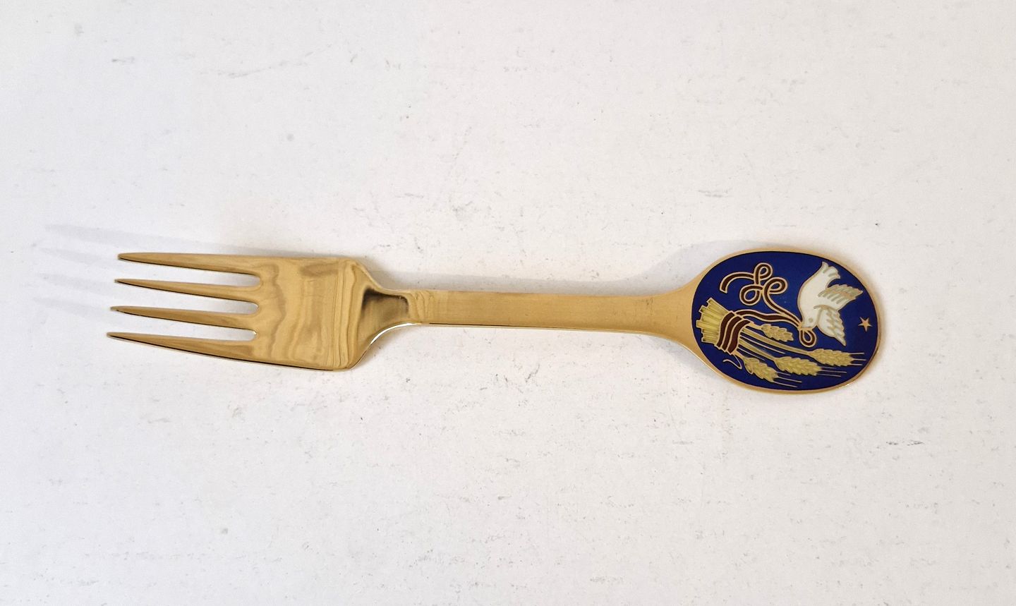 Beskrivelse: A.Michelsen julegaffel i forgyldt sterlingsølv og emalje fra 1985