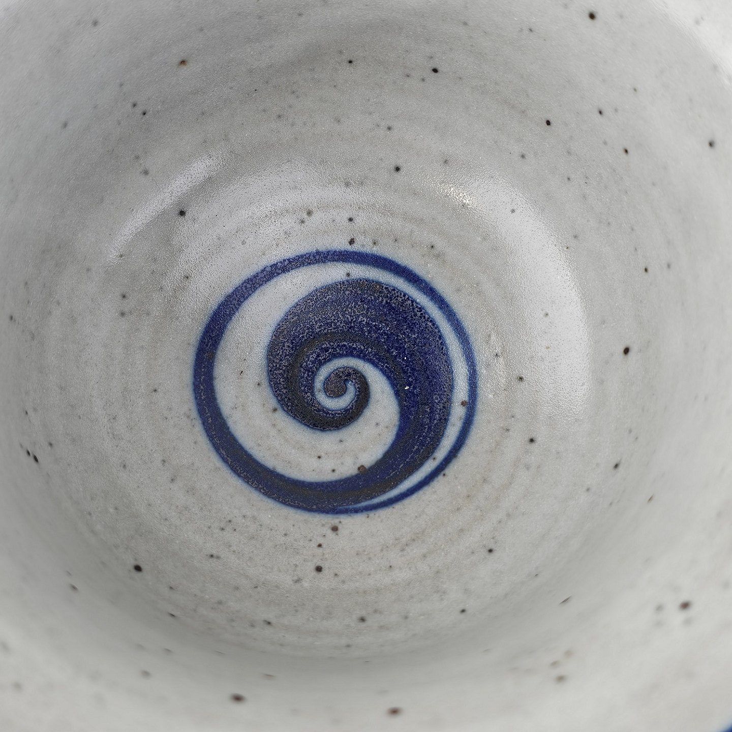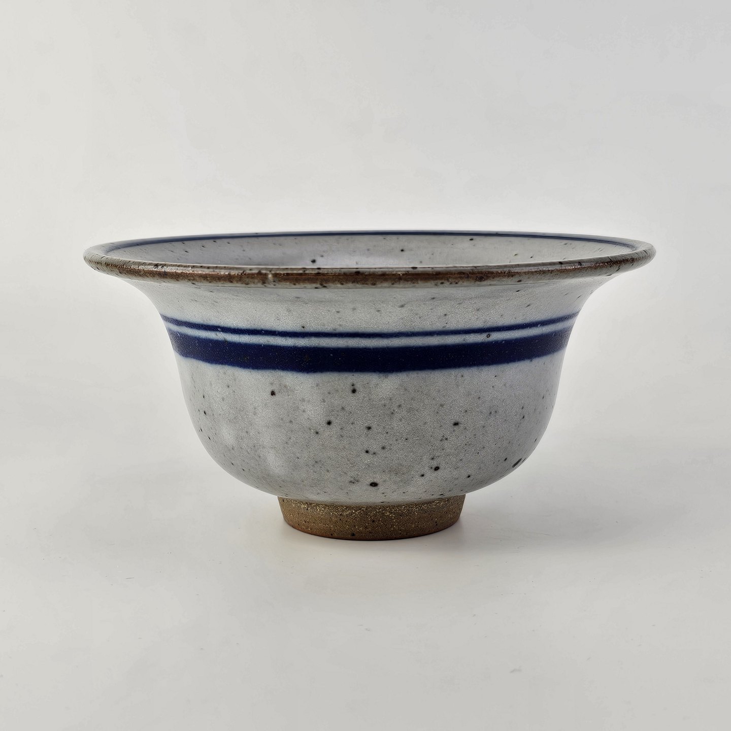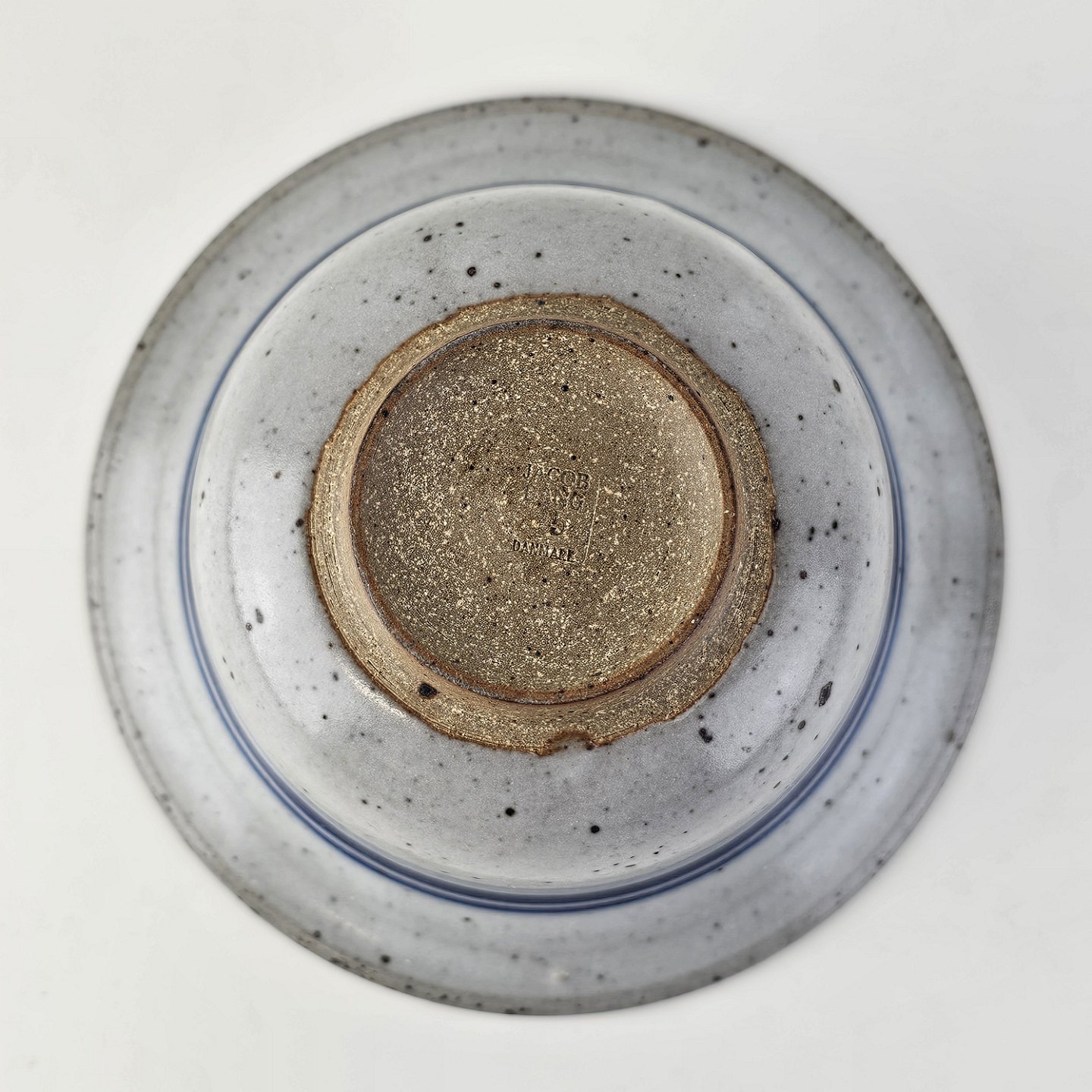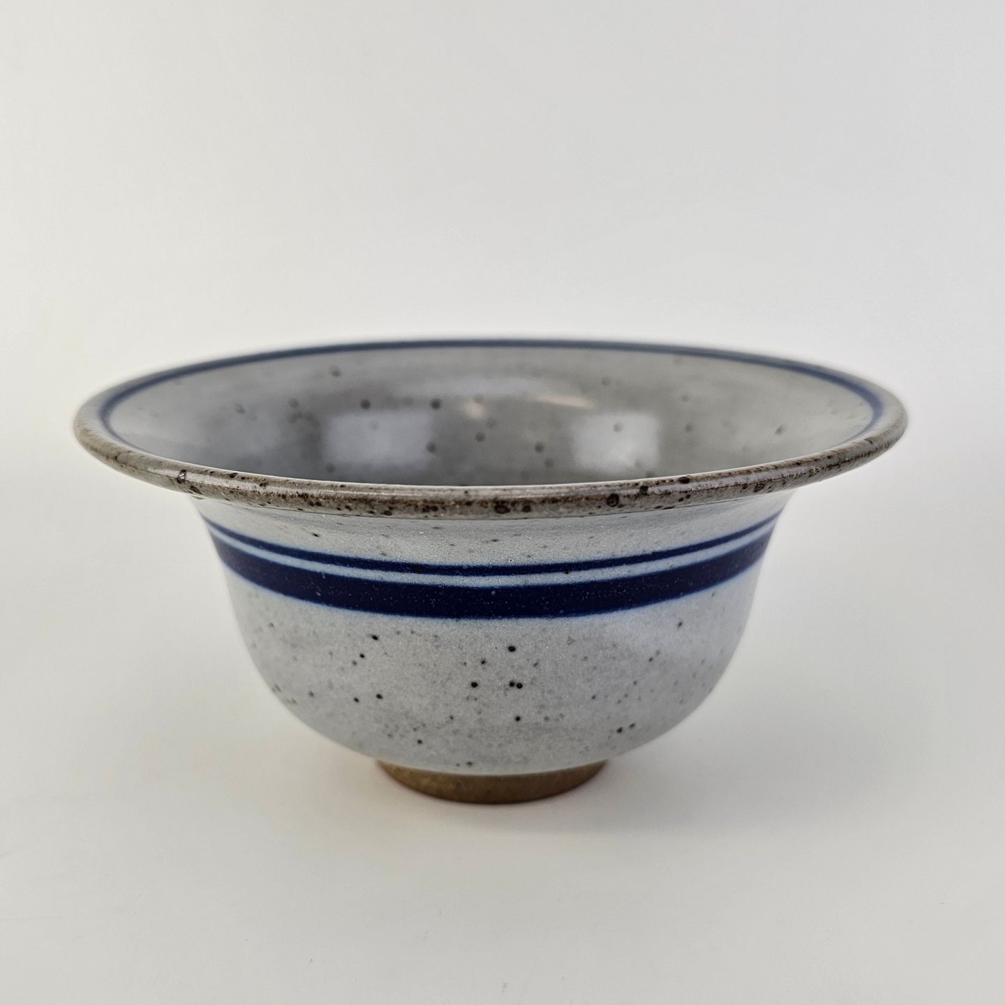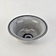 Beskrivelse: Skål i glaseret stentøj i hvide nuancer med dekoration af blå striber og en blå hvirvel i bunden