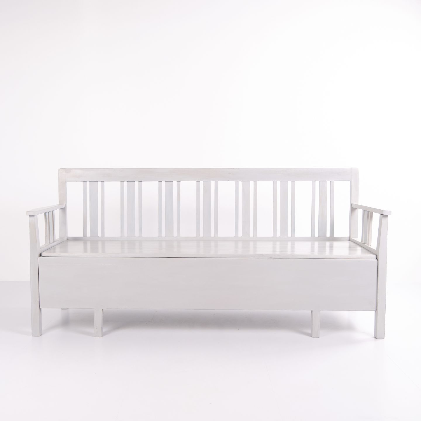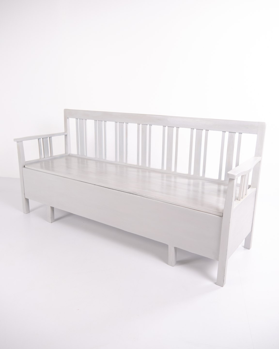 Beskrivelse: Svensk slagbænk fra ca. 1860’erne, udført i fyrretræ og gråmalet i senere tid. Klassisk skandinavisk møbel med dekorative bemalinger og praktisk sidde- og opbevaringsfunktion. Et solidt antikt stykke med tidstypiske detaljer.