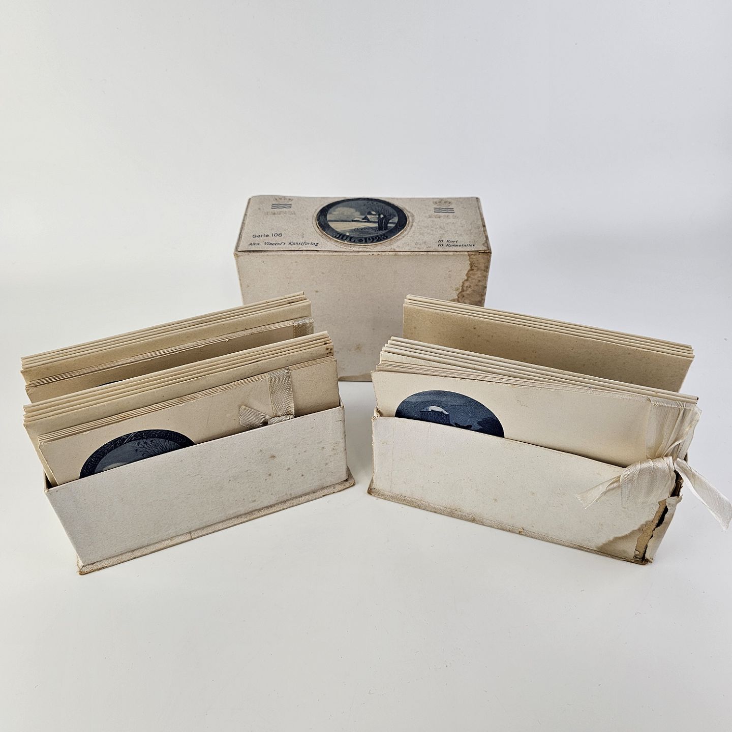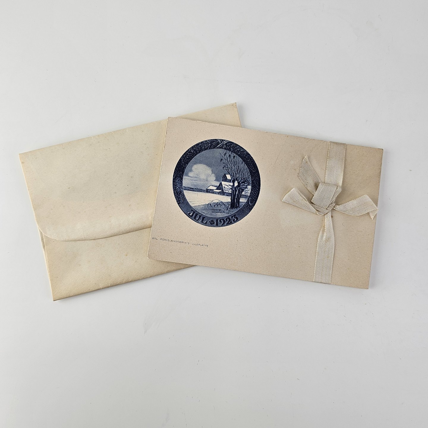 Beskrivelse: Brevkort med motiv af juleplatte fra 1923 fra Bing & Grøndahl og Royal Copenhagen. 10 kort og 10 kuverter