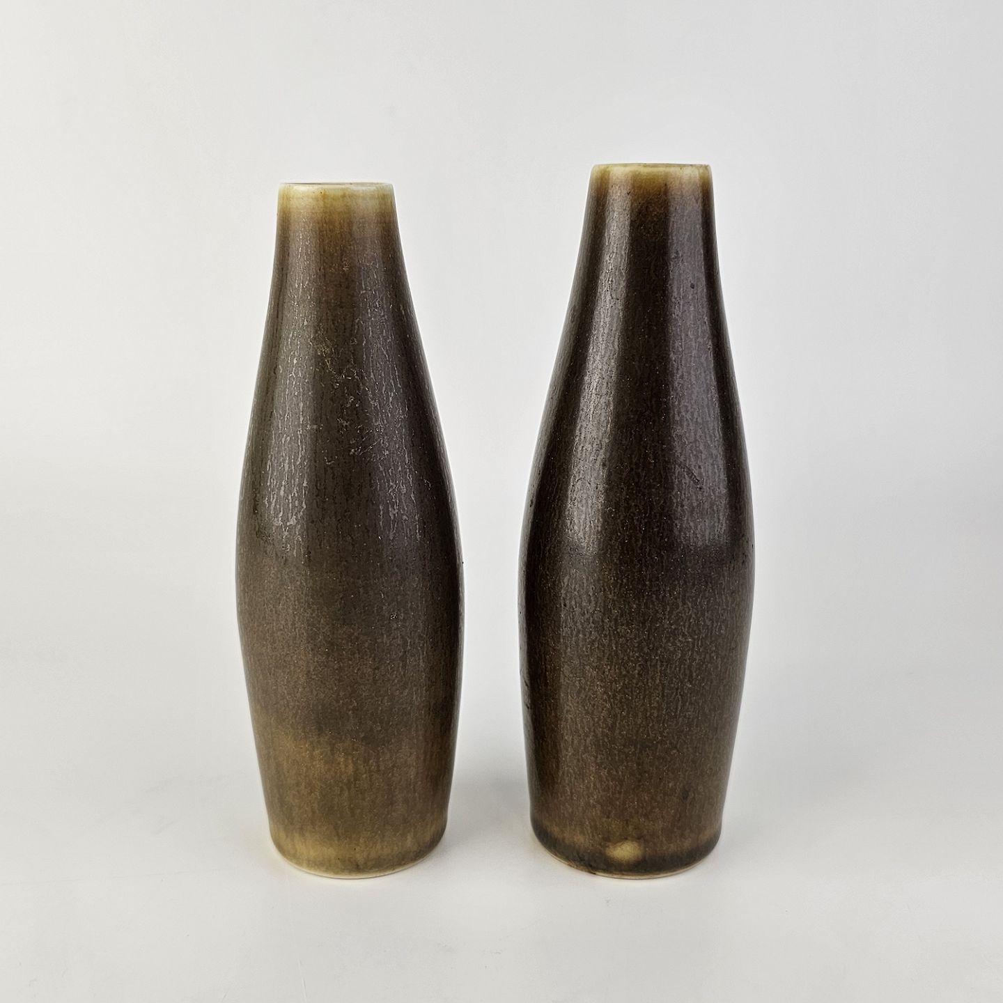 Beskrivelse: Sæt af to vaser i stentøj i harepelsglasur og med indsnævret hals