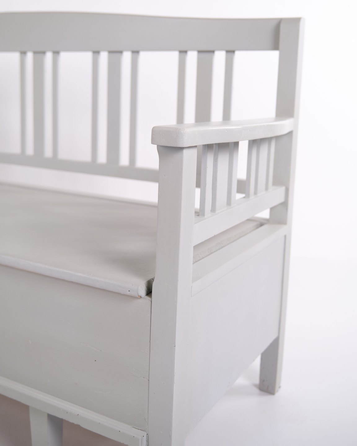 Beskrivelse: Svensk slagbænk fra ca. 1860’erne, udført i fyrretræ og gråmalet i senere tid. Klassisk skandinavisk møbel med dekorative bemalinger og god opbevaringsplads under sædet. Velbevaret antikt møbel med tidstypiske detaljer.