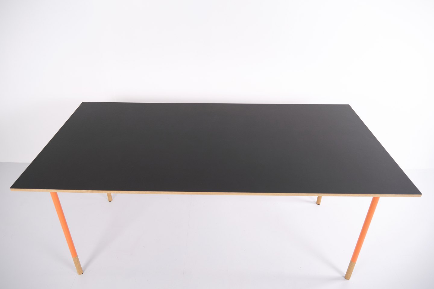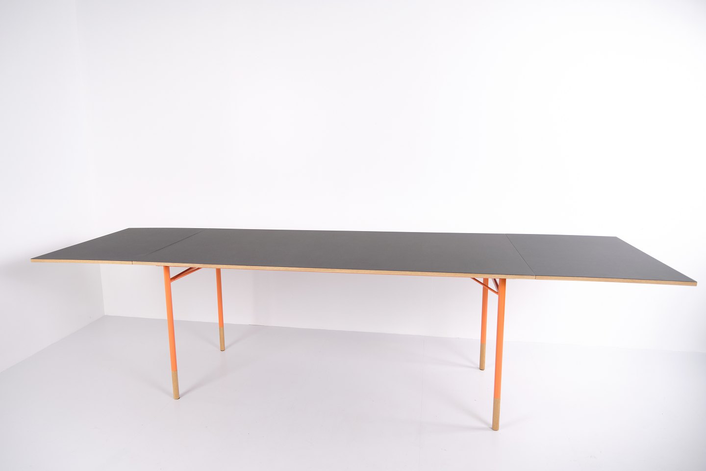 — Materiale: Grå linoleum, oregon pine kanter, orangelakerede stålben