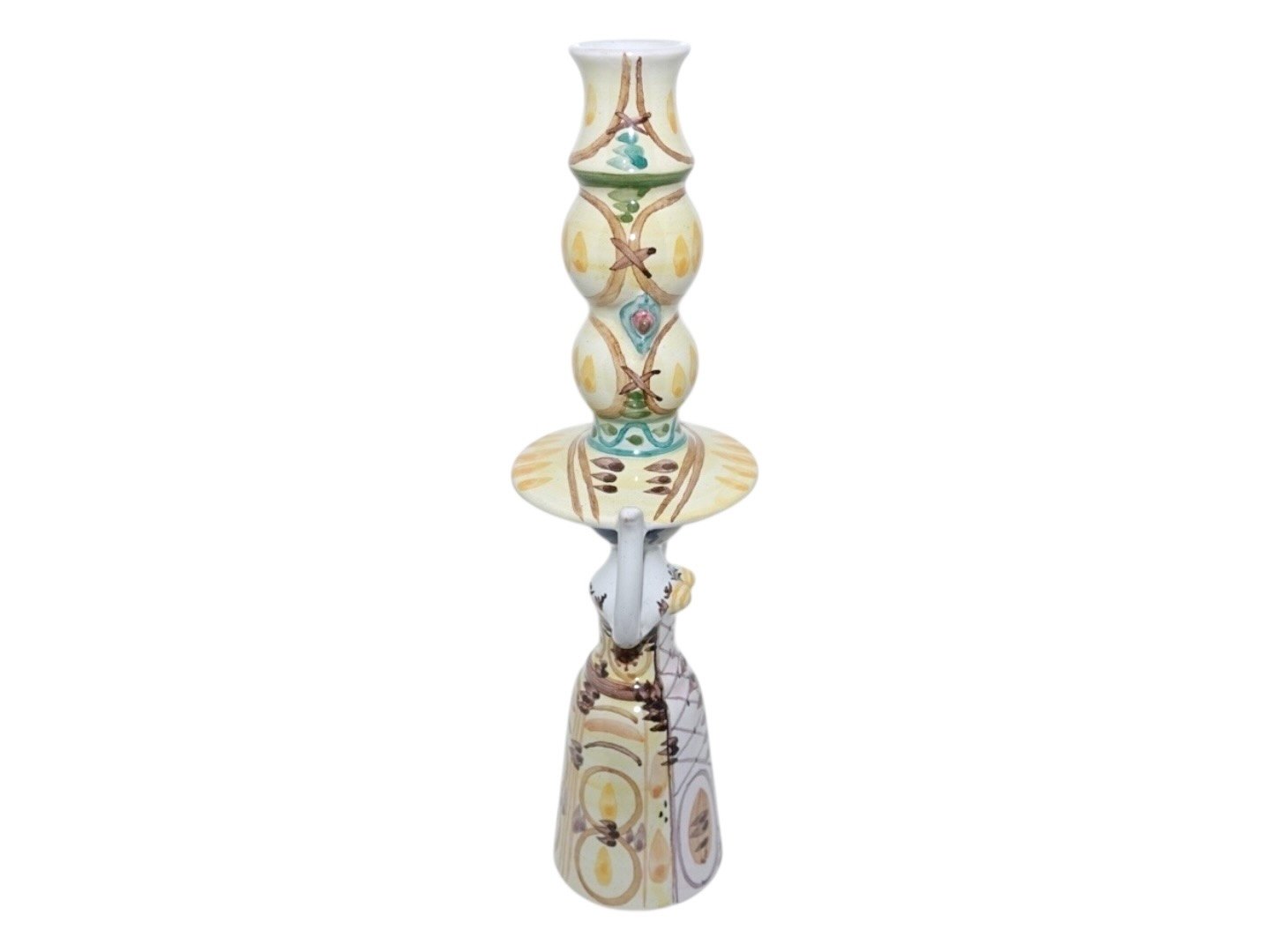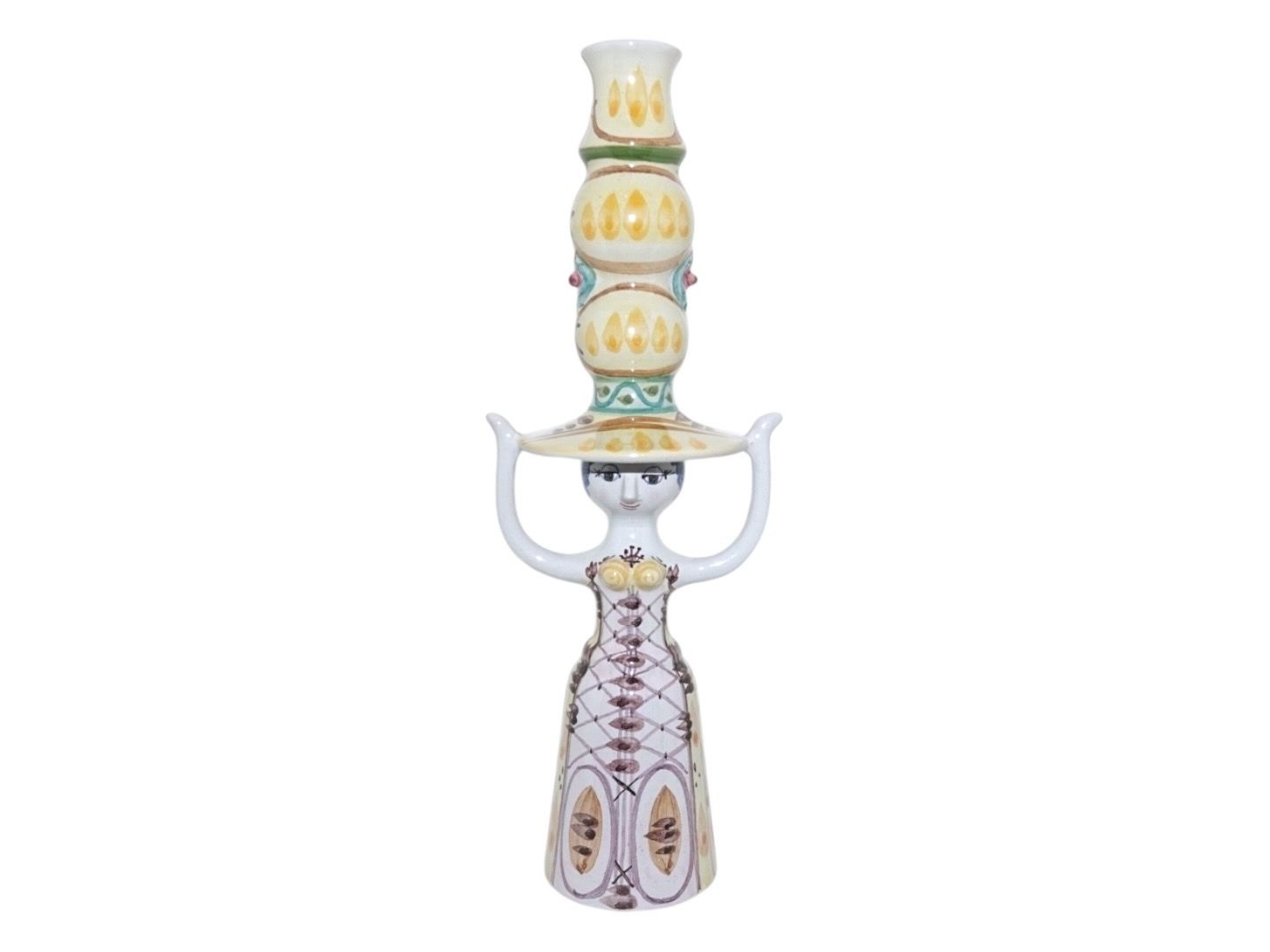 Beskrivelse: Bjørn Wiinblad keramik, høj figur af dame i gule farver fra 1974.