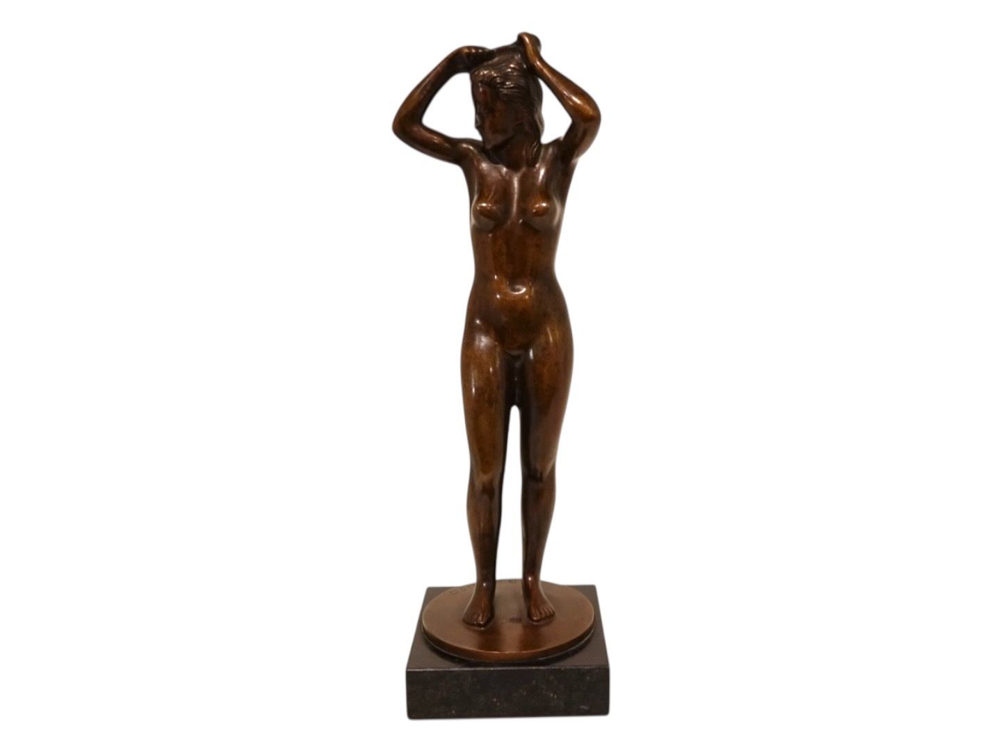 Beskrivelse: Volmer Bahner (1912-1995) bronze figur af nøgen dame der reder sit hår. Hun står på en sten sokkel.