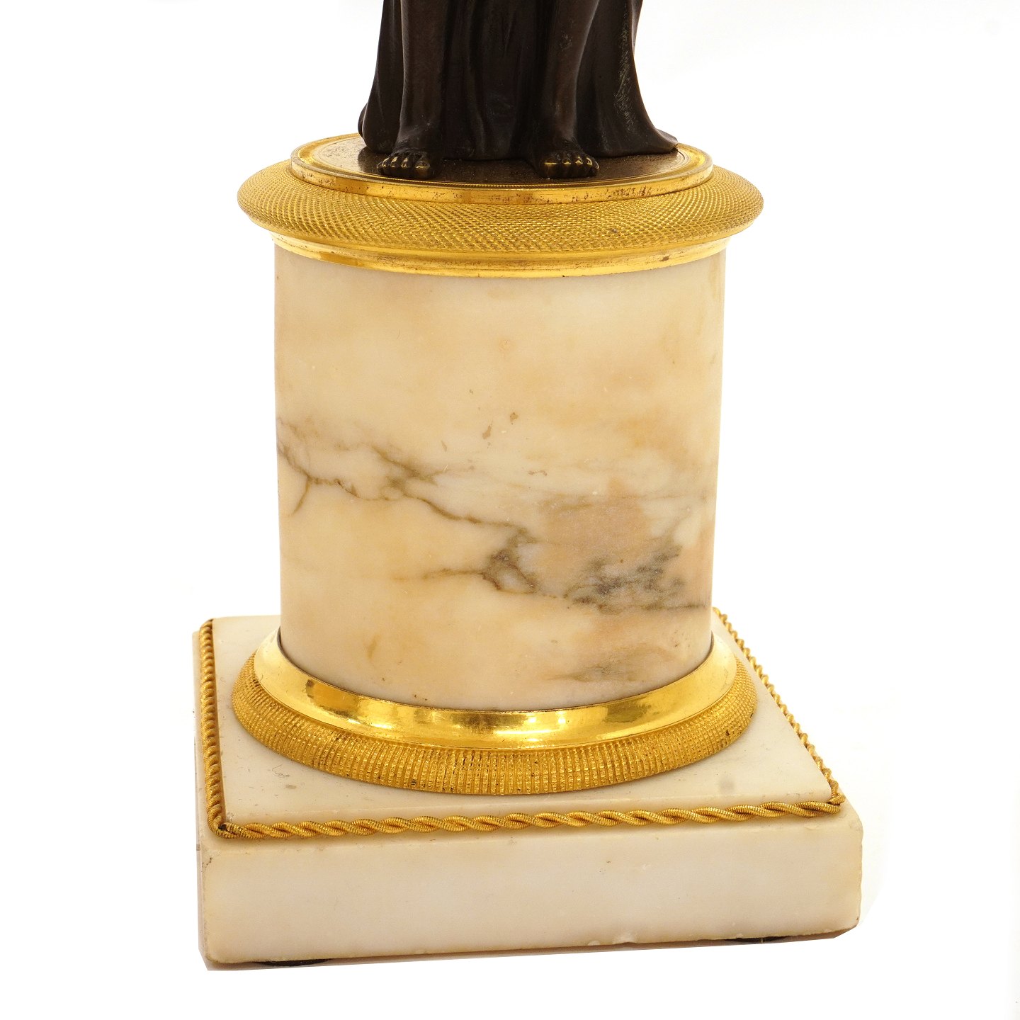 Et par store lueforgyldte og delvist sortpatinerede kandelabre med marmorfod og -stamme. Frankrig ca. år 1810. H: 73cm