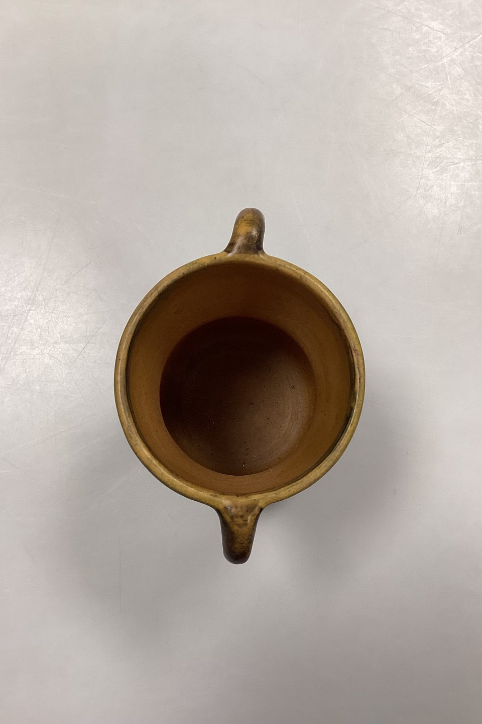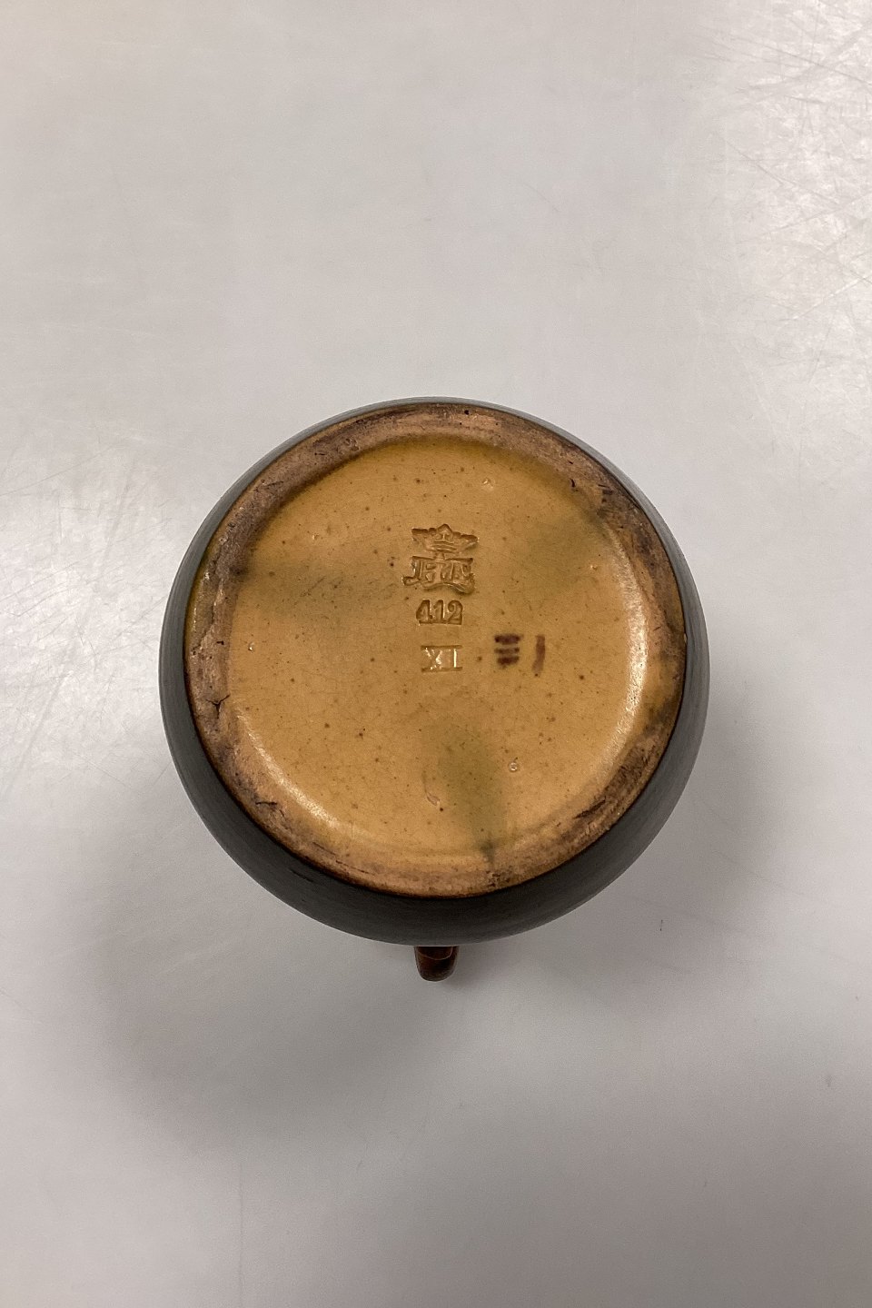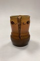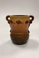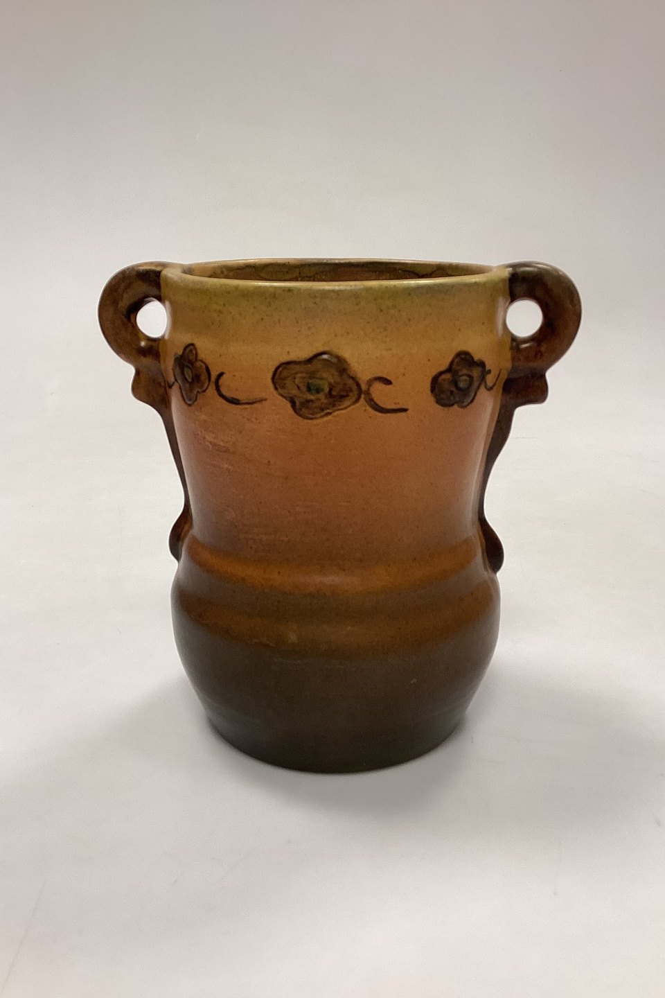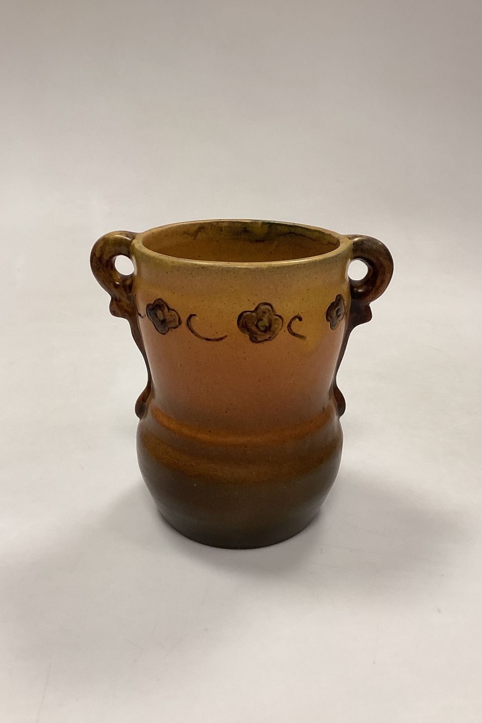 Beskrivelse: P. Ipsens Enke Vase No. 412. Stentøj med gul og brun glasur, med prægede blomster i kanten.