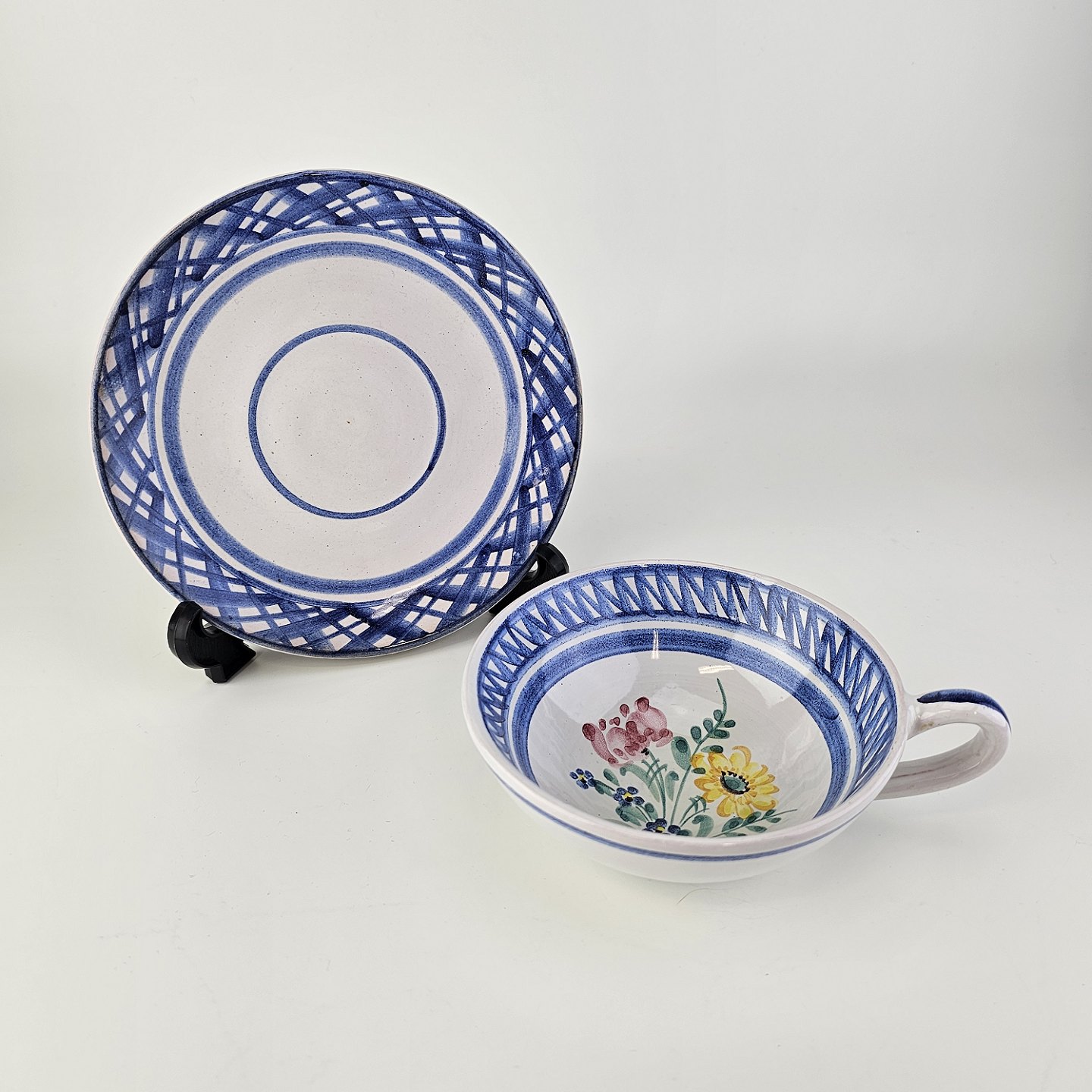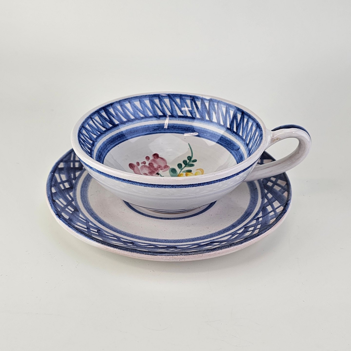 Beskrivelse: Kop og underkop i keramik med blå detaljer og blomsterdekoration