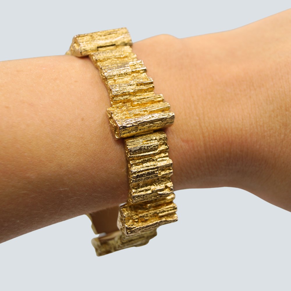 Beskrivelse: Björn Weckström for Lapponia; Leddelt armbånd af seks led i 14 kt. guld. Designet af Björn Weckström omkring 1970. L. 18 cm. b. 1,3-1,8 cm. Monteret med kasselås og sikkerhedslås. Stemplet "585 Finland Bjorn Lapponia"