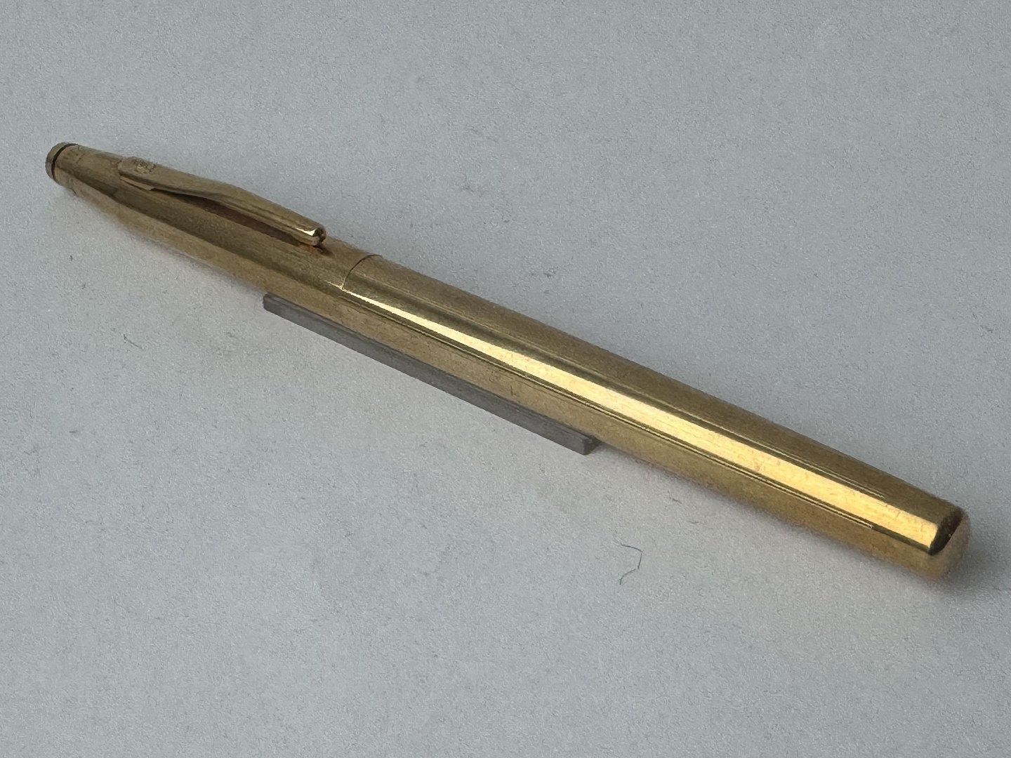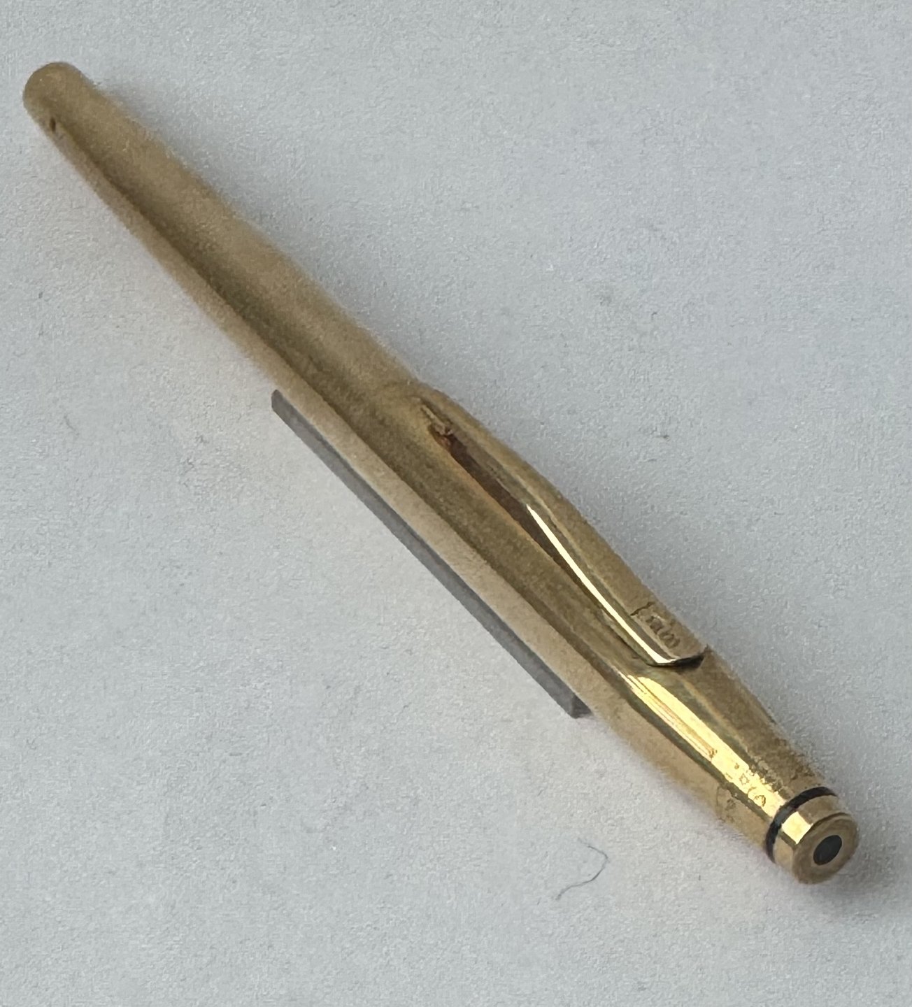 Description: Cross fountain pen in gold-double with piston filler ink filling system. All parts original including a 14 carat gold nib. Appears in good condition and ready to be used. L. 13.4 cm