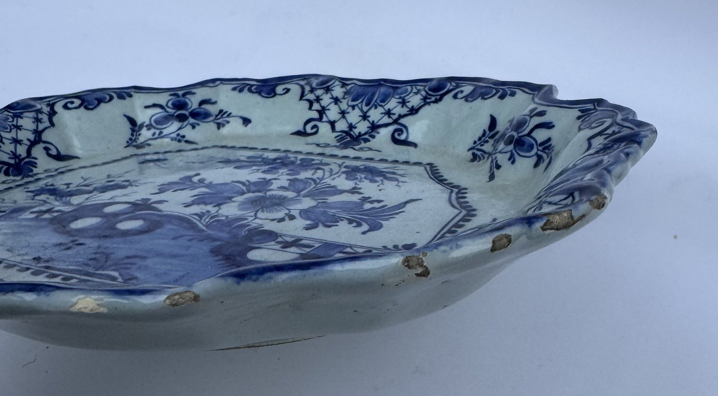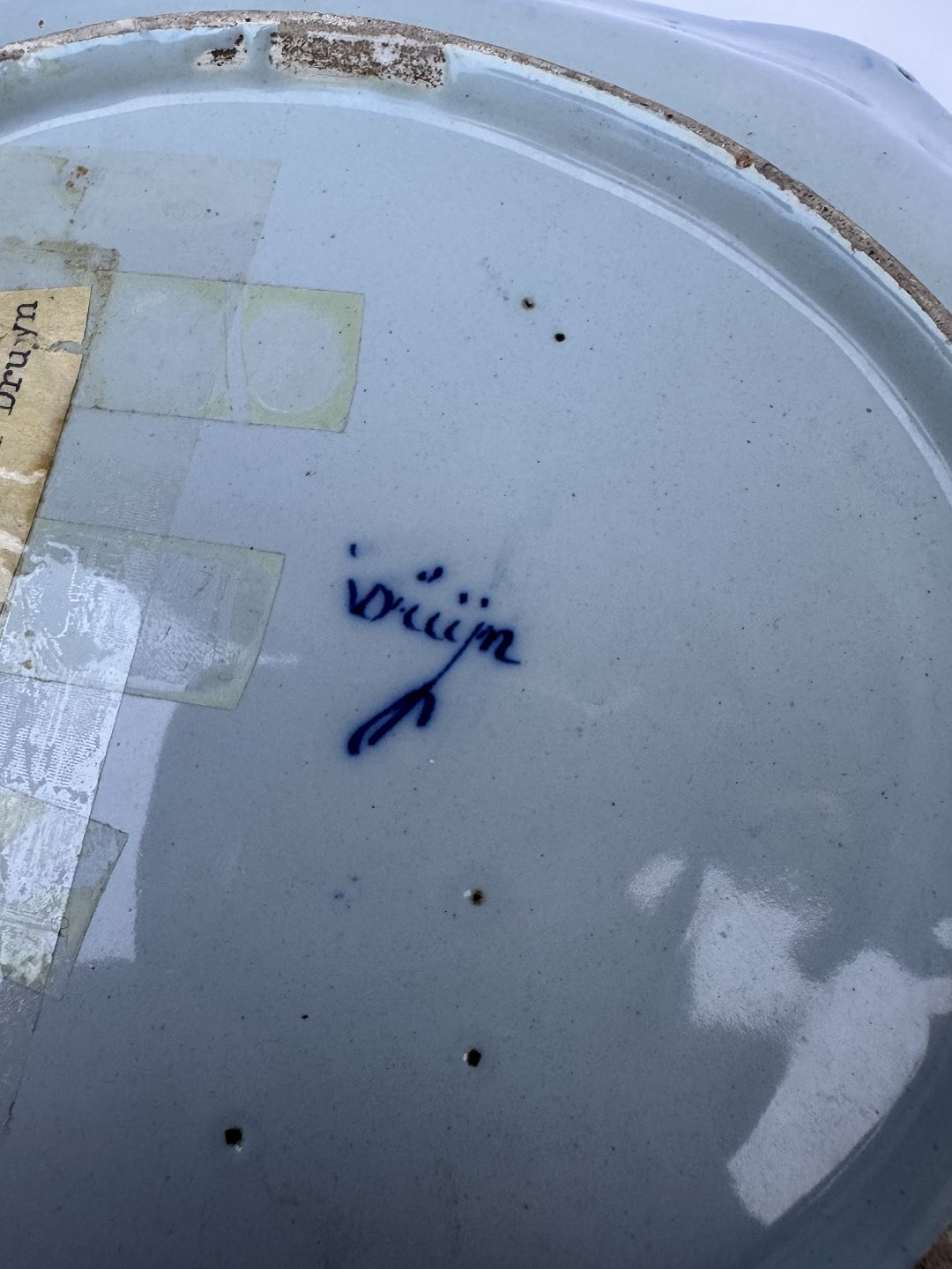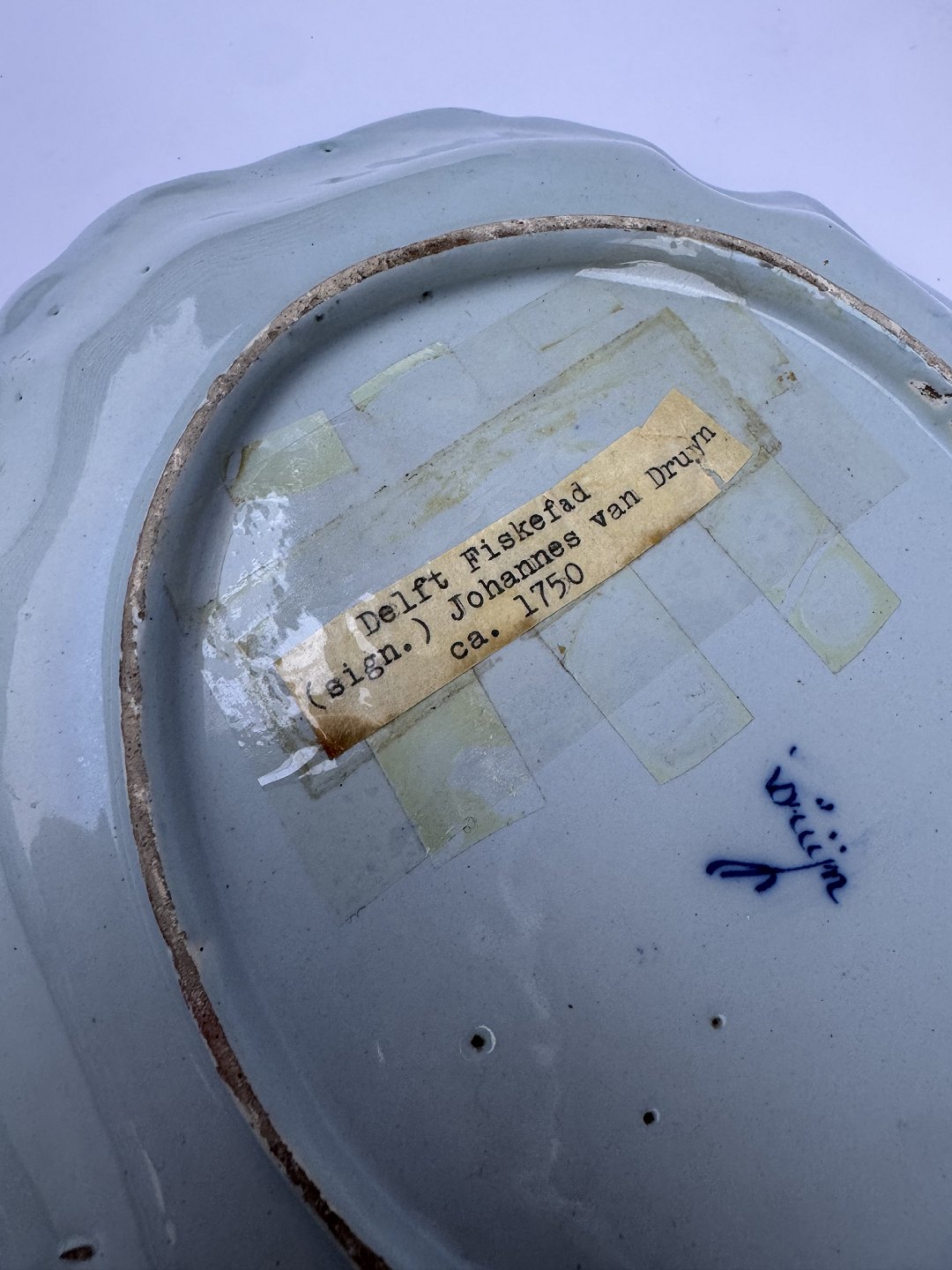 Beskrivelse: BLÅ BLOMSTER DEKORATION: Delft fajance fiskefad fra den nederlandske fabrik van Duyn fremstillet omkring 1765. Fremstår i god stand med alders relaterede brugsspor rundt på kanten i form af små overflade afslag i glasuren (se mange fotos). Der udover ingen skader eller reparationer. Fabriksmærket på bunden samt gammel label med dansk tekst. Mål:H.3,4 cm, L. 23,3 cm, D. 20,9 cm
