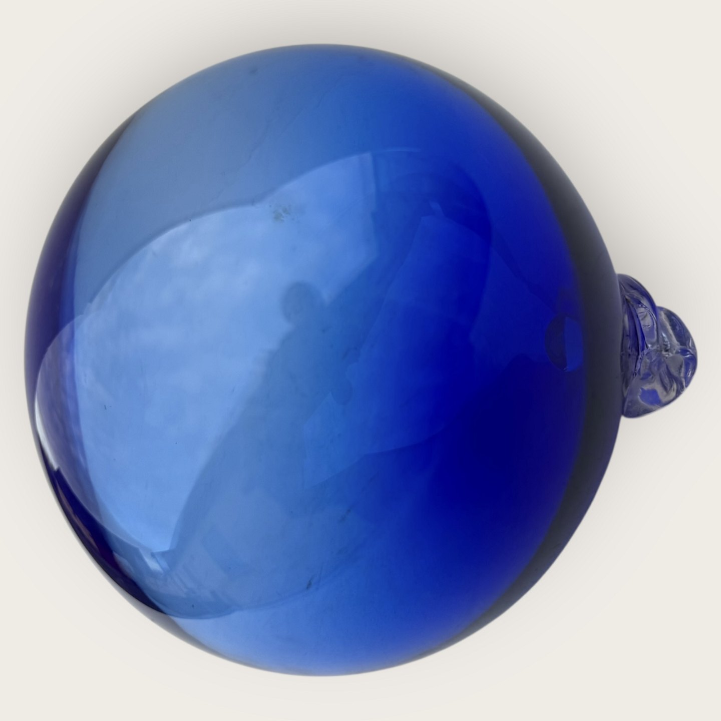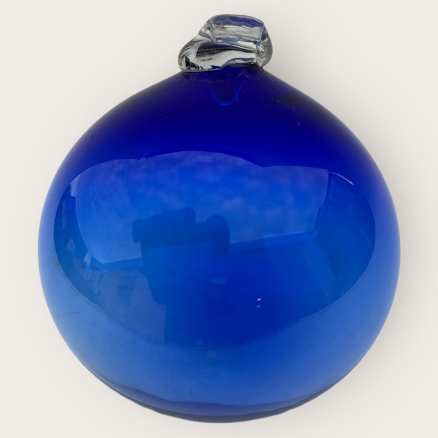 Beskrivelse: Blå glas kugle til ophæng eller til brug sammen med Carnaby / Otto Bauer vaser, muligvis fremstillet på Holmegaard, Ca. 11 cm i diameter *Pæn brugt stand*