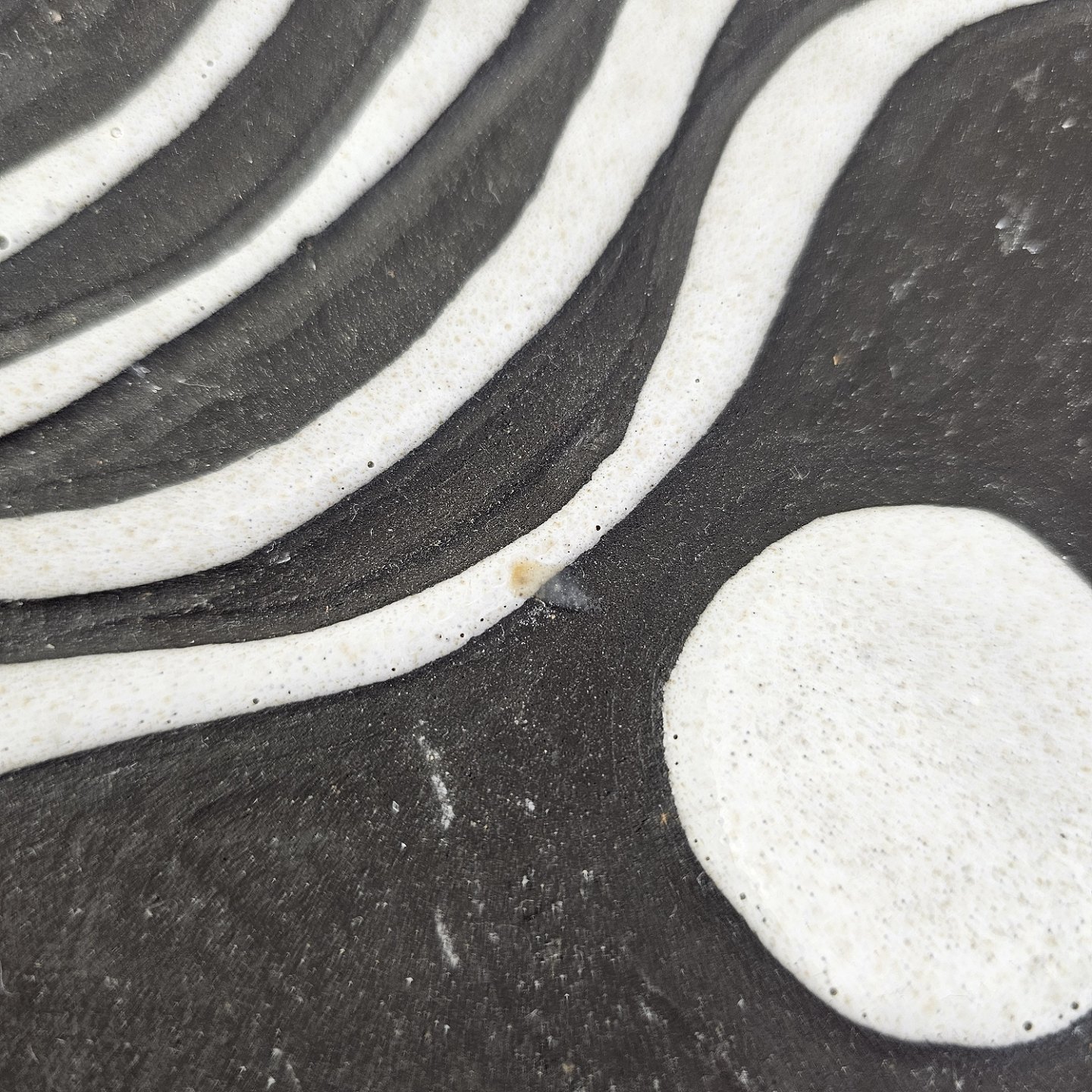 Beskrivelse: Fad i keramik fra Negro serien med abstrakt motiv på mørk baggrund. Nr. 5608-2
