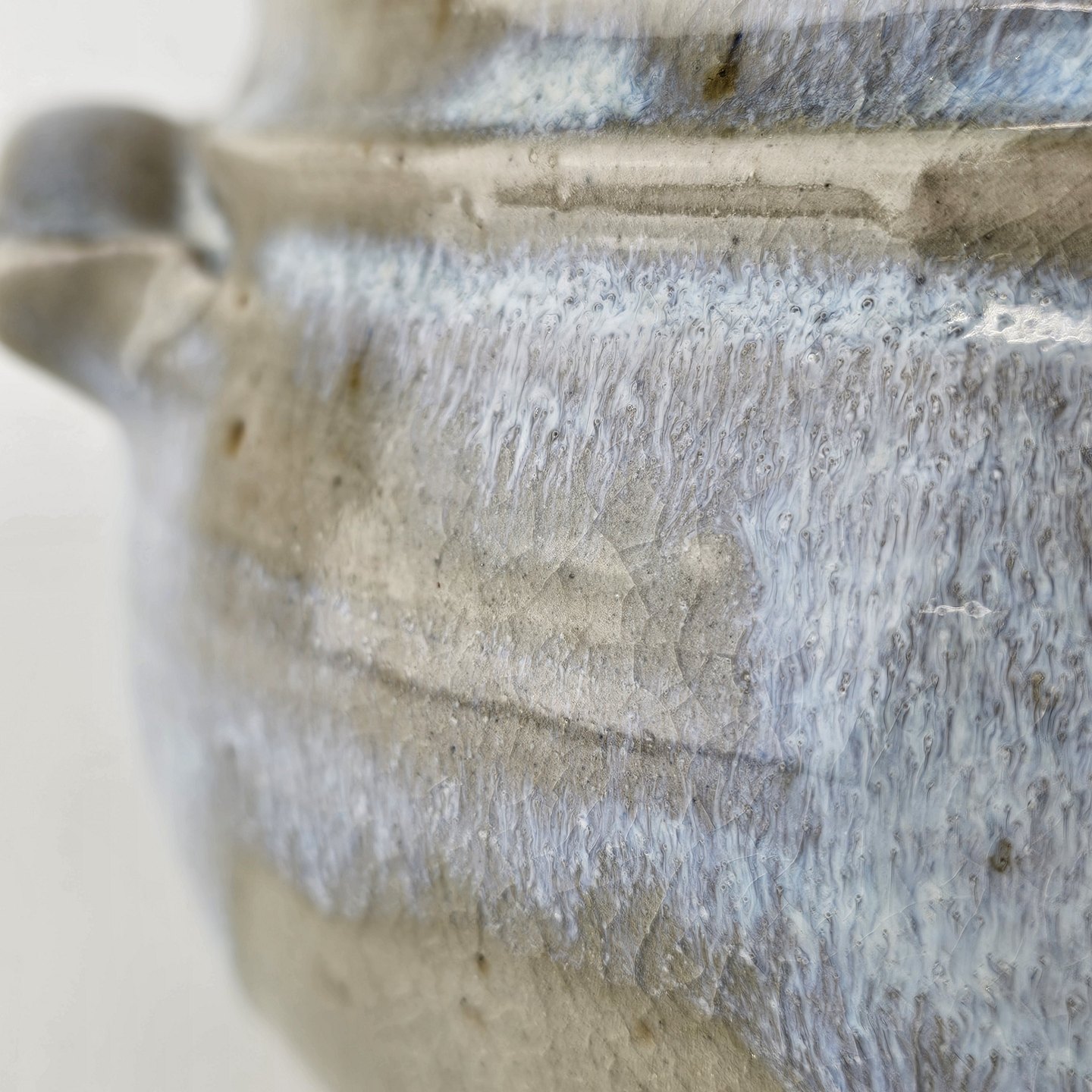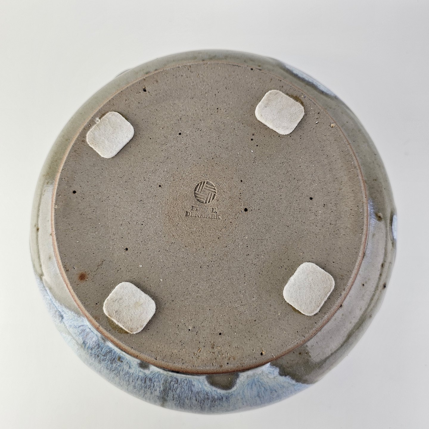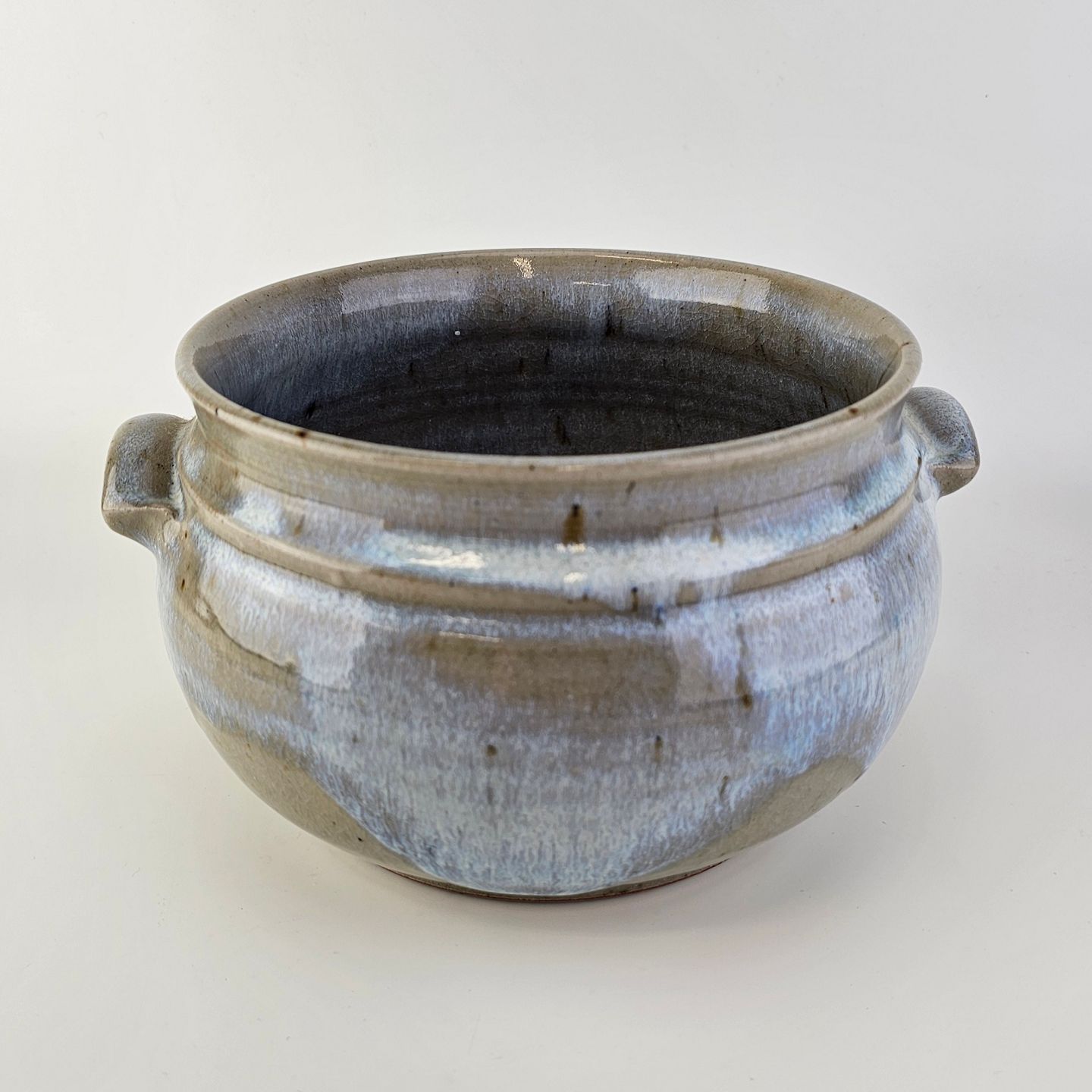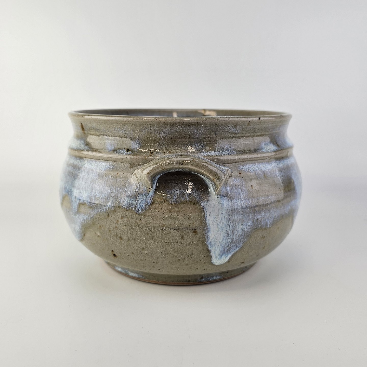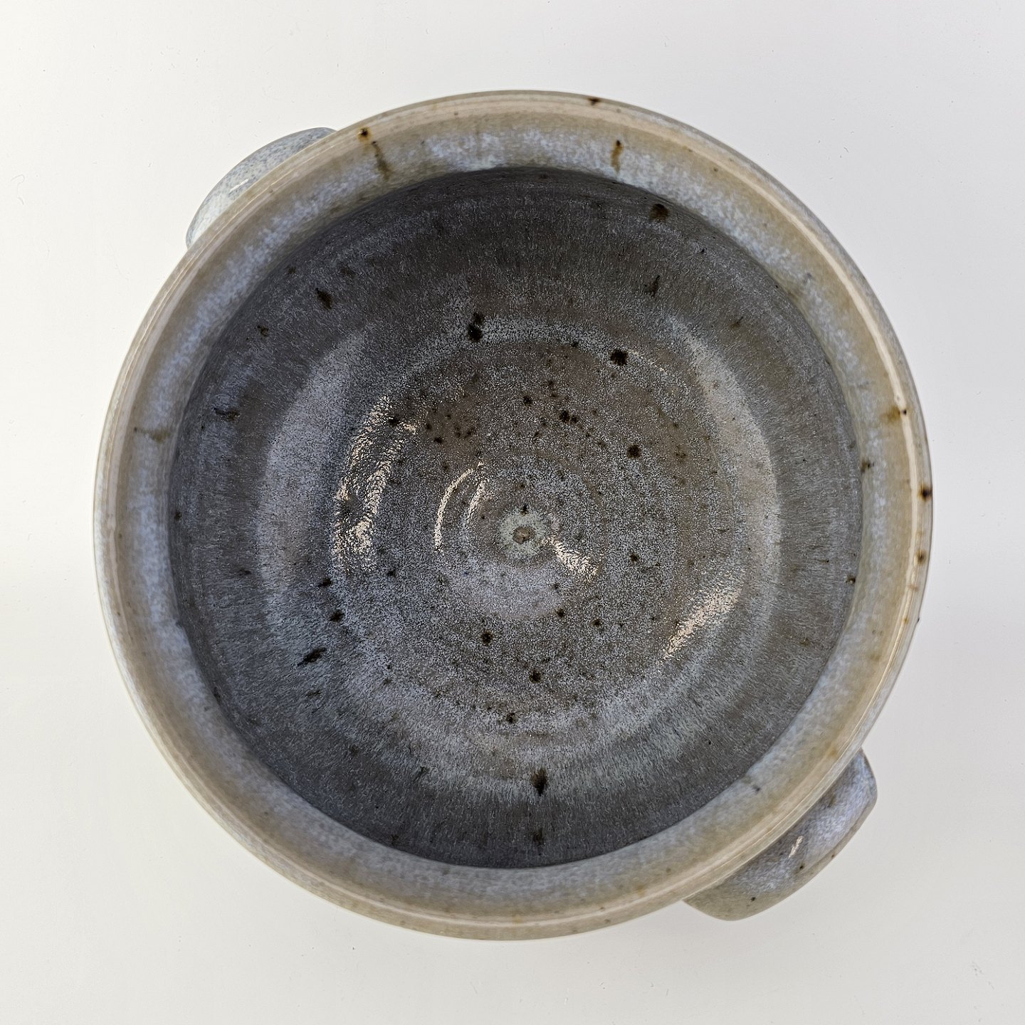 Beskrivelse: Blålig og grønlig keramik unika skål med 2 hanke med krakkeleringer i glasuren.
