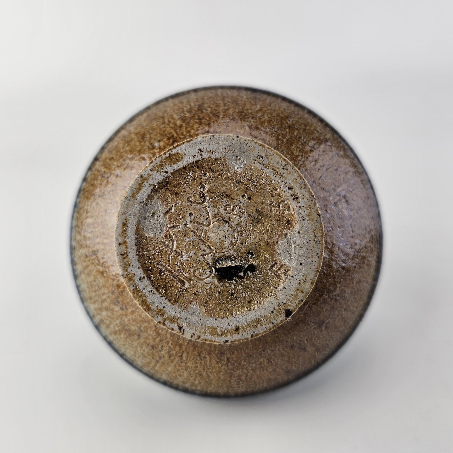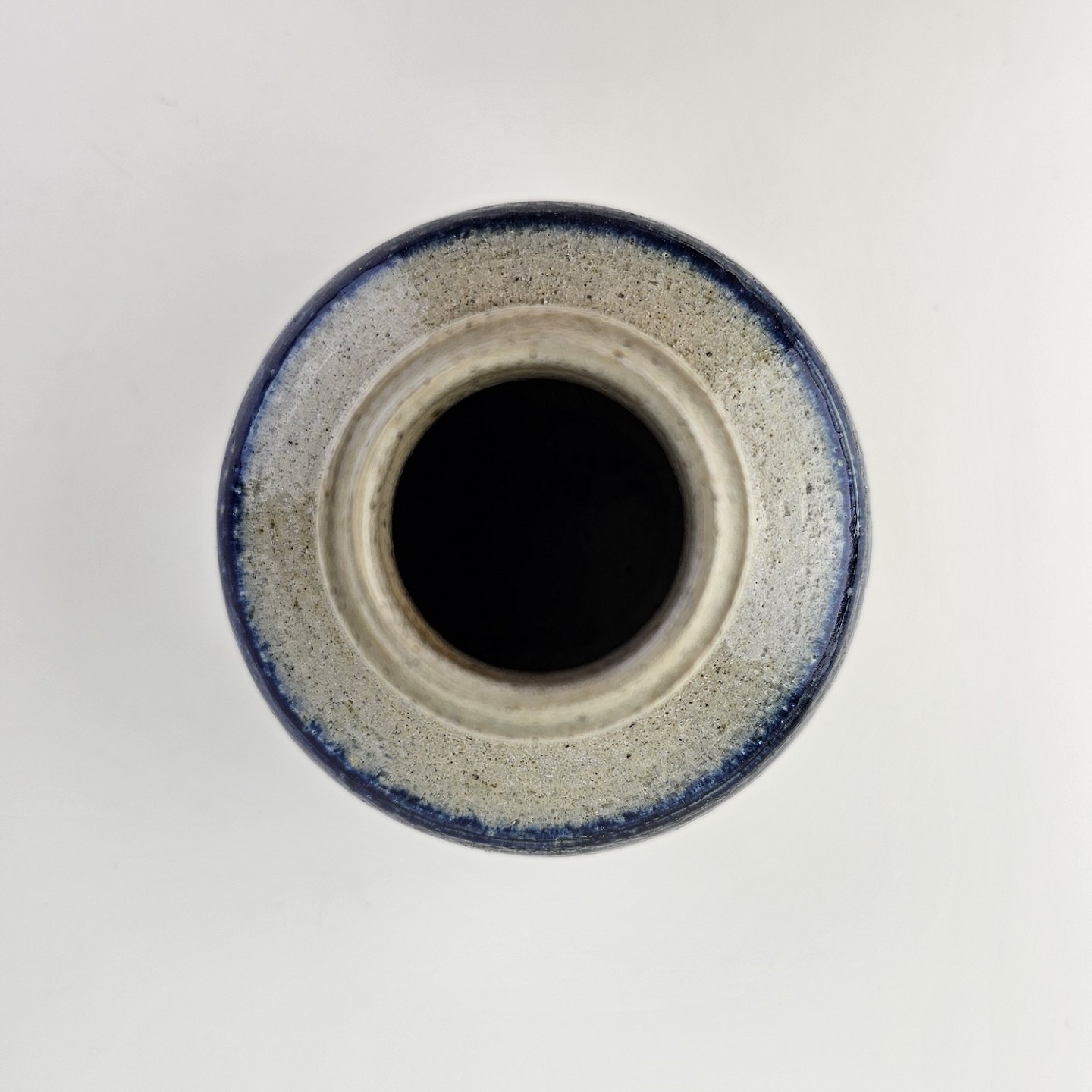 Beskrivelse: Vase smal fod og topi grå glasur, og bred midt for i blålig farve