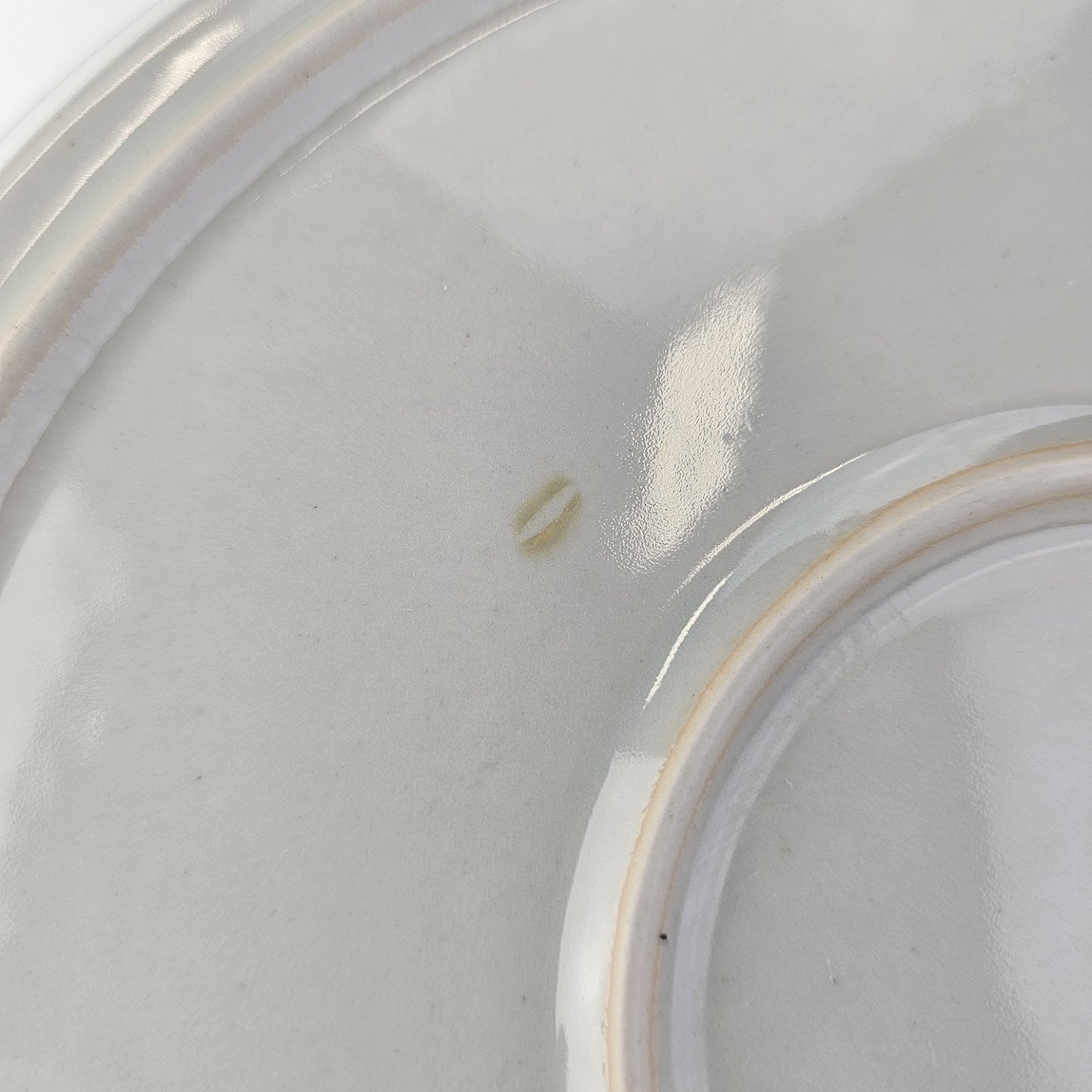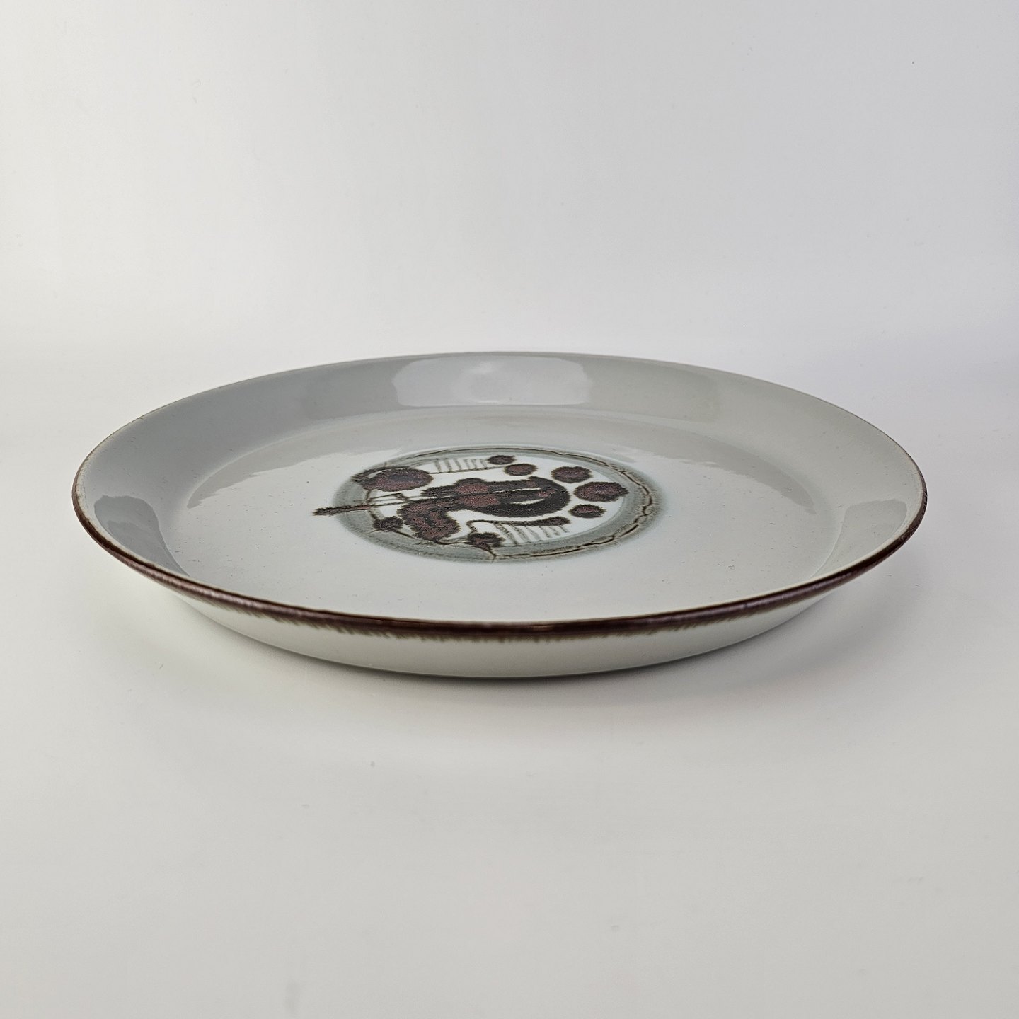 Beskrivelse: Rundt fad i stellet Thule, grålig tone med mønster midt for.