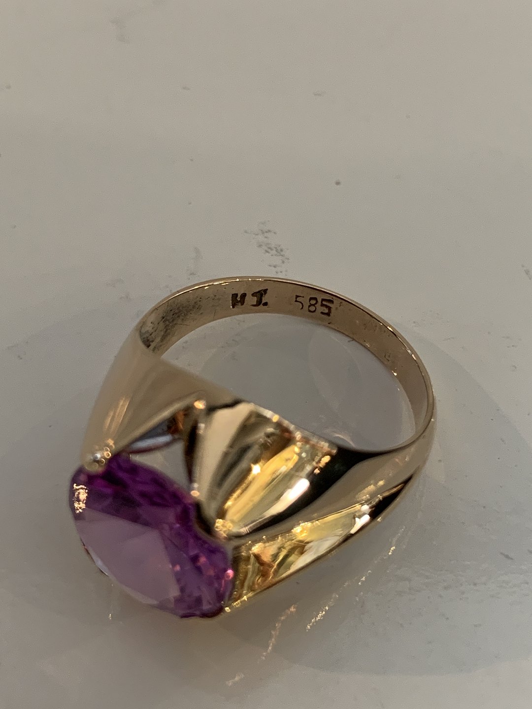 Beskrivelse: Vintage Damering med lilla sten 14 Karat Guld