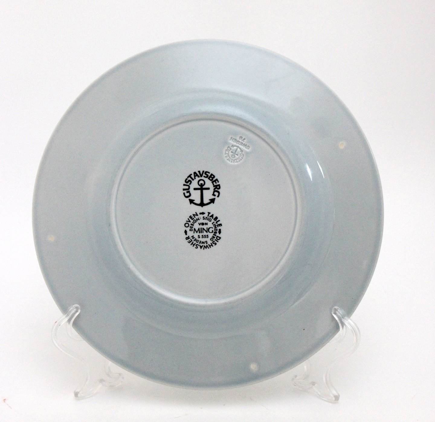 Beskrivelse: Gustavsberg, Sverige, Ming, Frokosttallerken. Designet af Stig Lindberg i 1979. Lyseblå glasur med mørkeblåt motiv. Mærke: "Gustavsberg Sverige. Design Stig Lindberg, Stentøj MING, VDN S555. Ovn, bord, opvaskemaskine". God stand. Diameter 19,5 cm. Pris: 125 kr. stk. Lager: 6