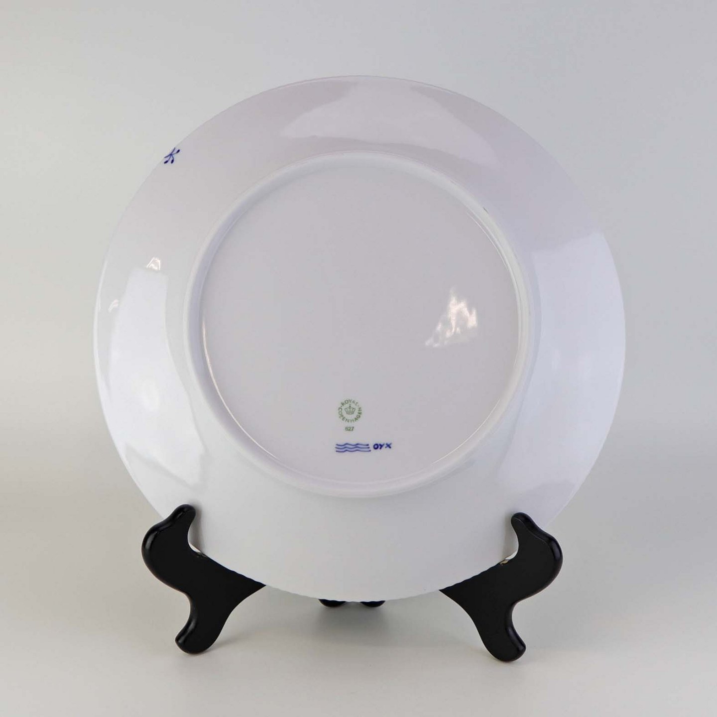 Beskrivelse: Flad middagstallerken i kongeligt porcelæn fra stellet Blå Elements. Nr. 627