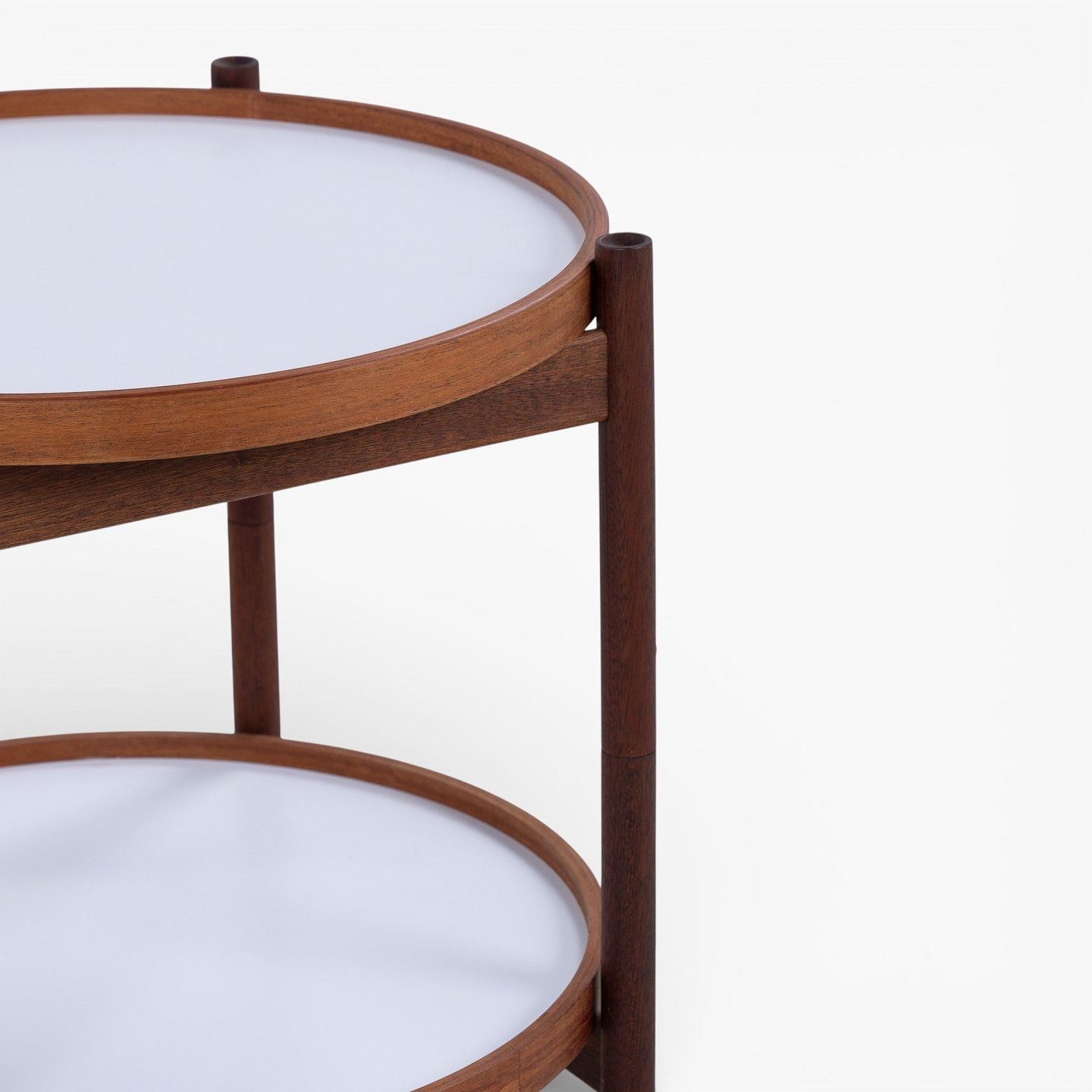 Bakkebord i teak med to vendbare bakker i sort og hvid formica. Mærket fra producent.