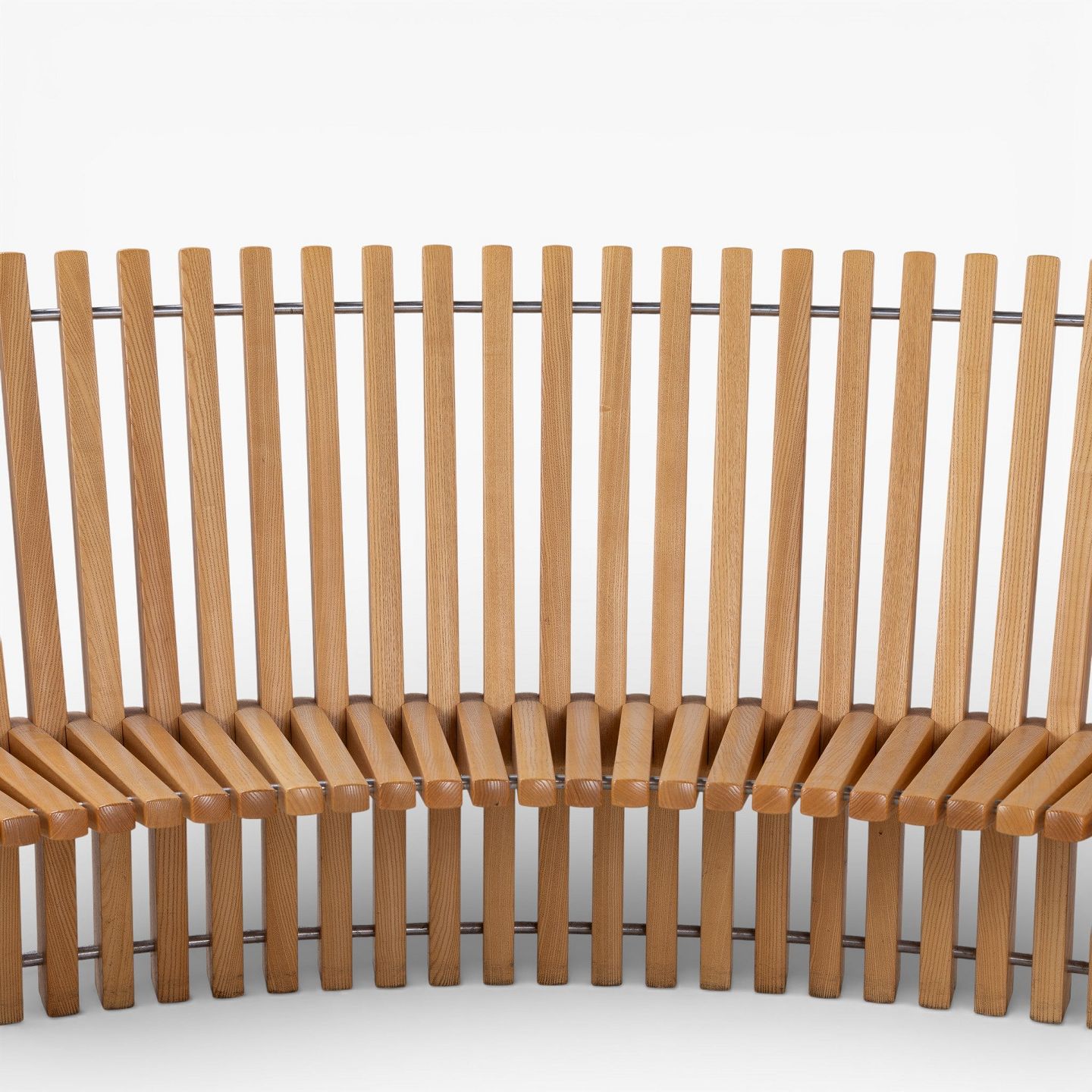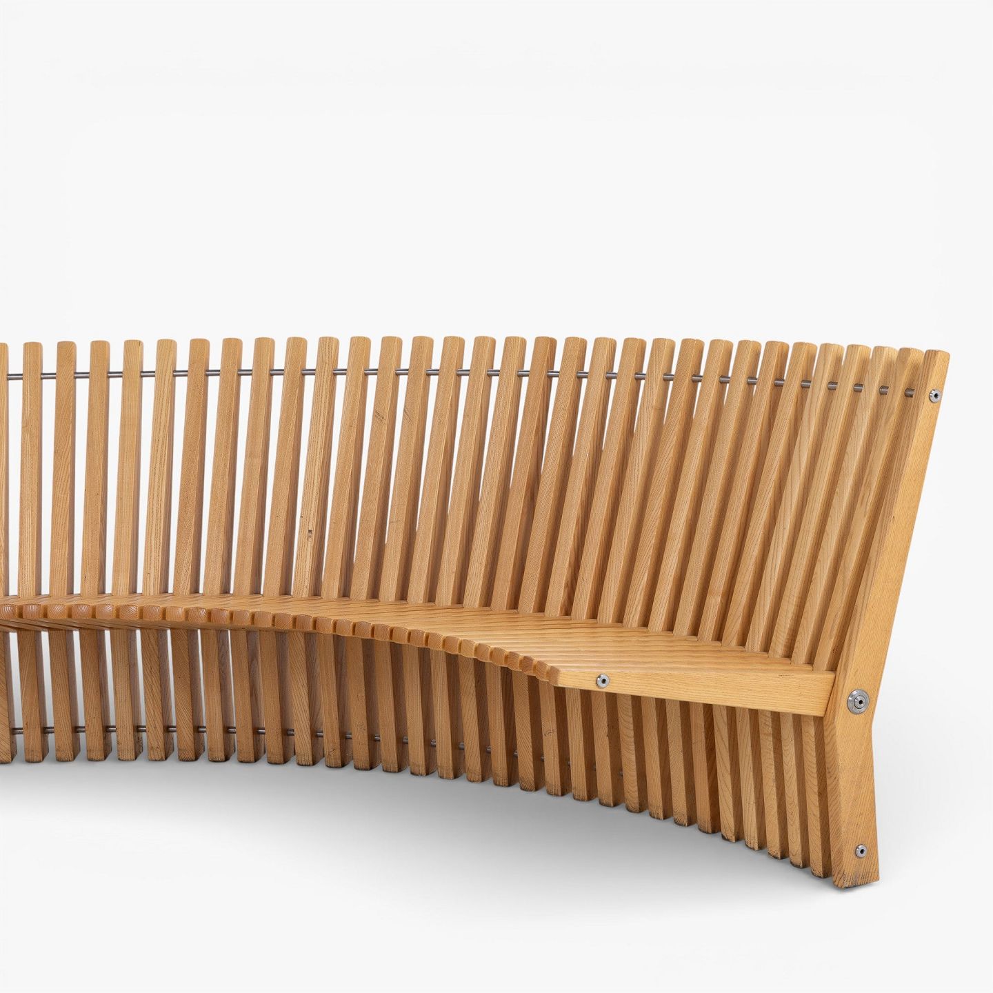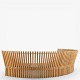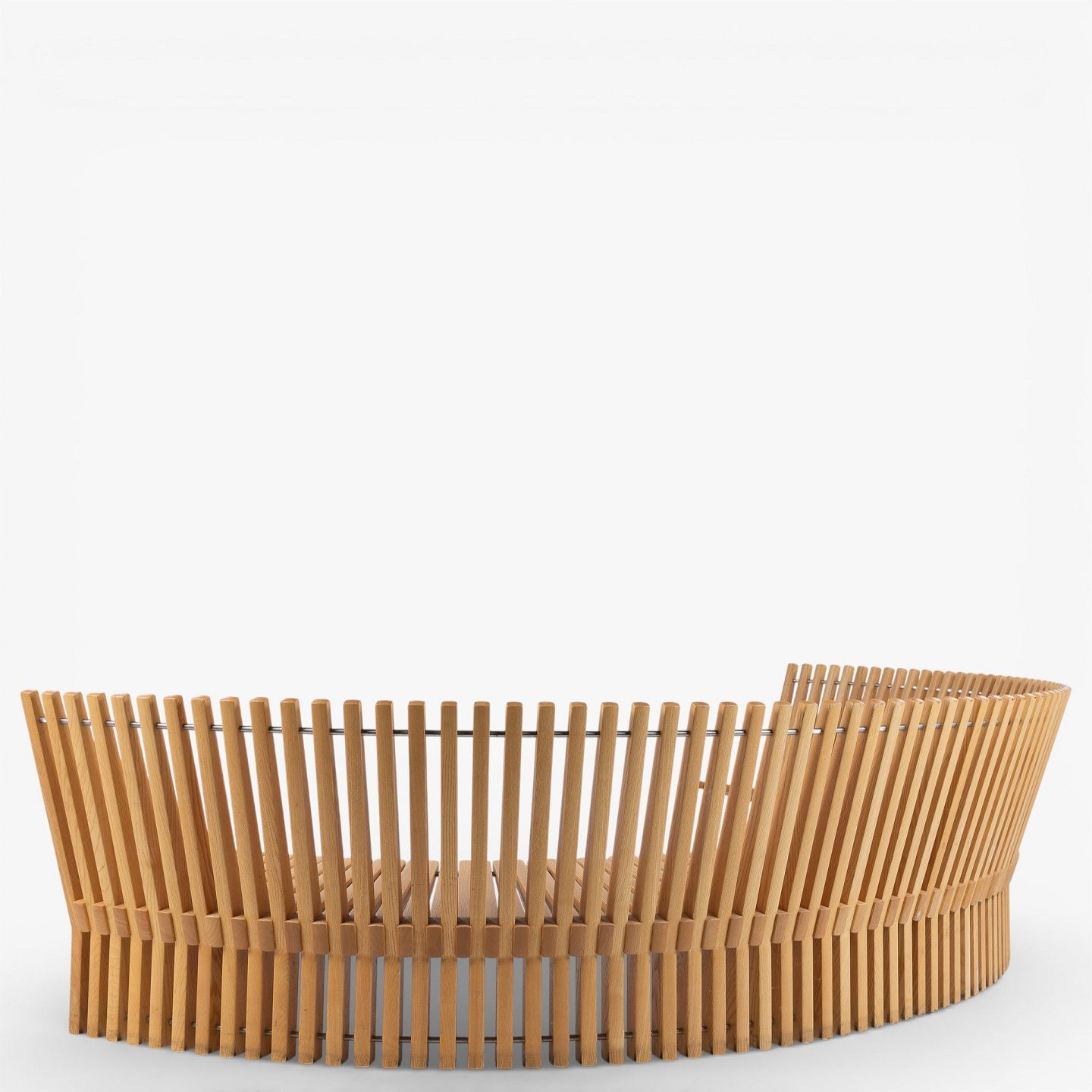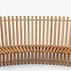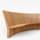'Astral'-bænk i massiv patineret elmetræ i form af en halvcirkel. Formgivet i 1979.