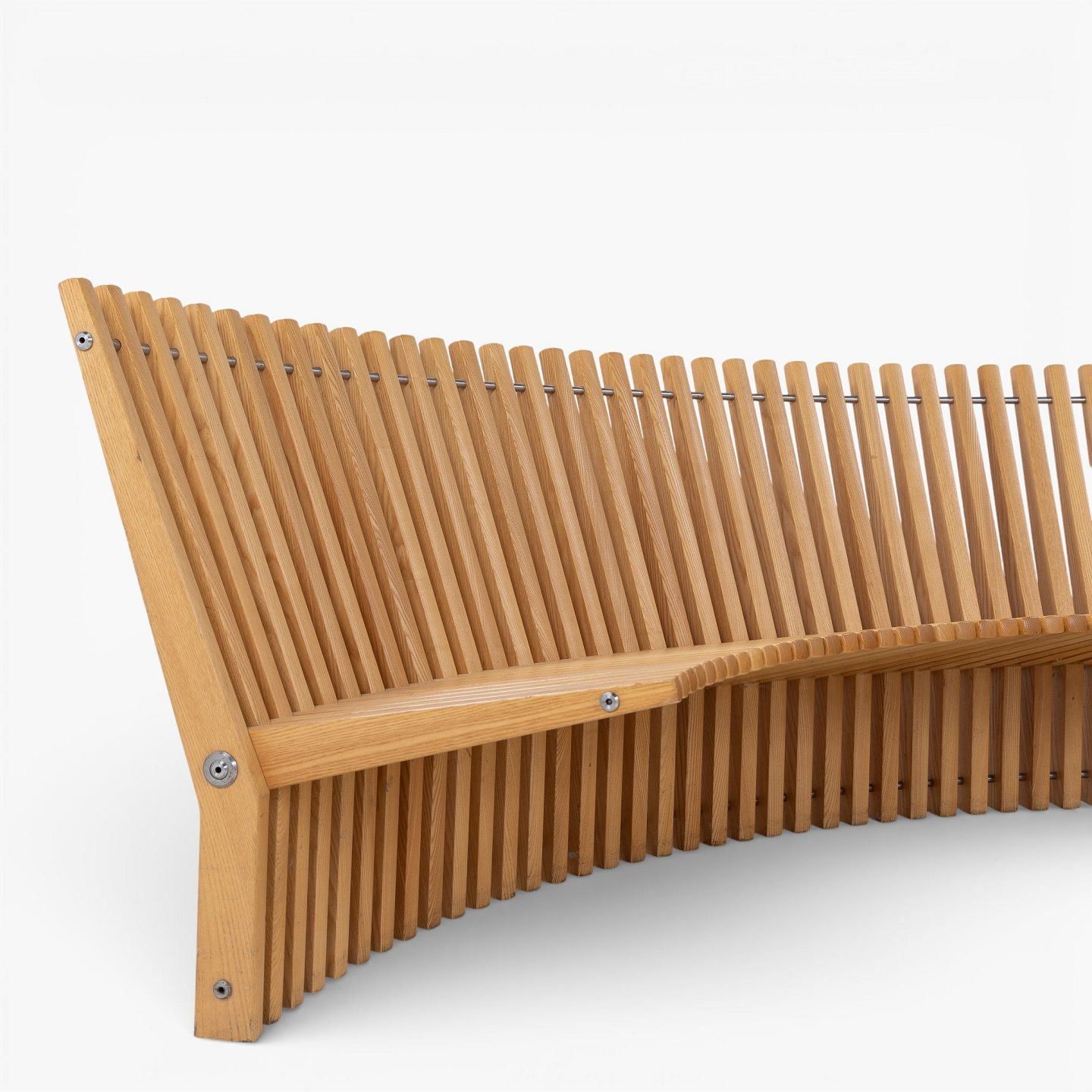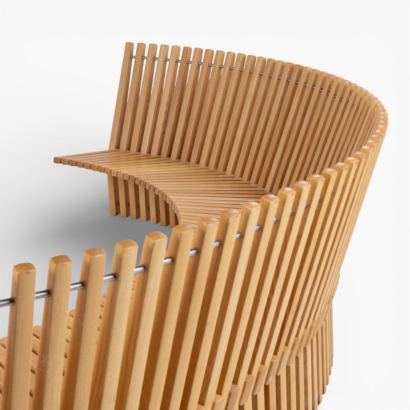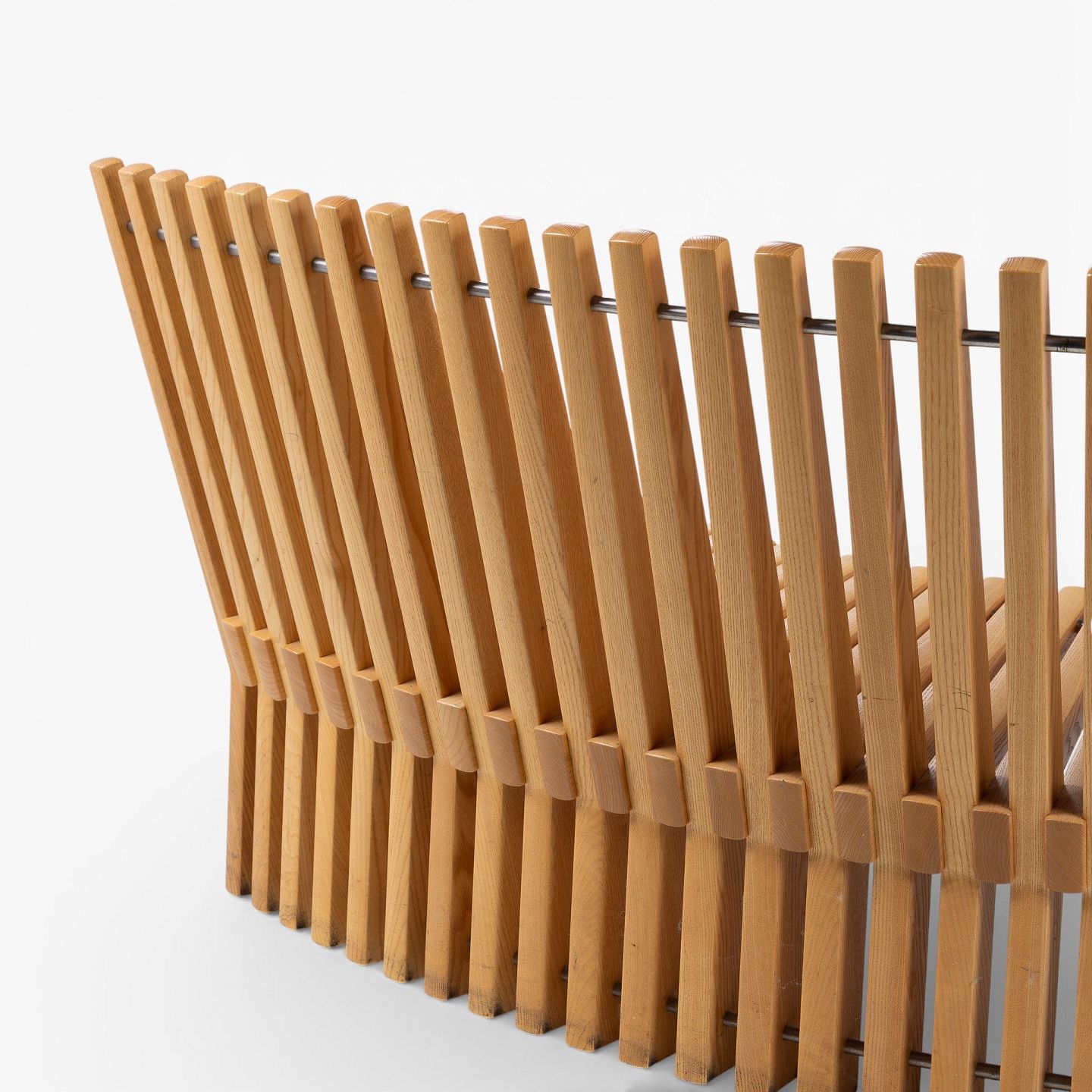 'Astral'-bænk i massiv patineret elmetræ i form af en halvcirkel. Formgivet i 1979.