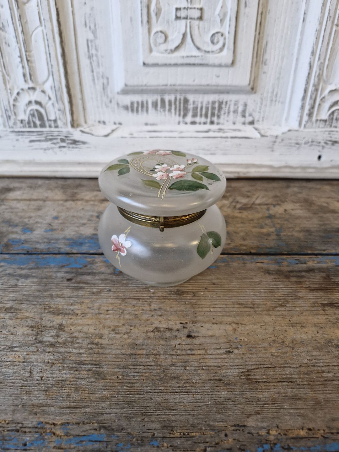 Beskrivelse: Smykkeskrin i glas med forgyldt bronze montering.