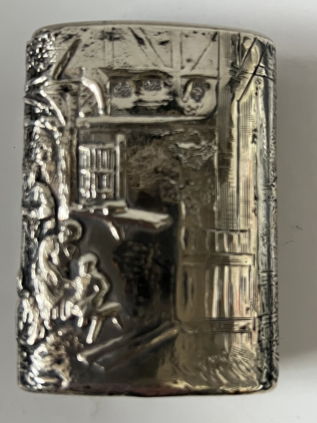 Beskrivelse: Smuk og dekorativ lille sølvæske i sterlingsølv, med flot motiv på både forside og bagside. Æsken er lavet således, at den inderste del kan skubbes ud. Derfor kan æsken bruges til mange forskellige formål. Brug den eksempelvis til tændstikker, piller, tandstikke eller noget helt andet. Sølvæskens flotte motiv giver æsken liv. Ved at pudse æsken, kan den blive helt flot og skinnende og være en praktisk og dekorativ genstand i hjemmet.