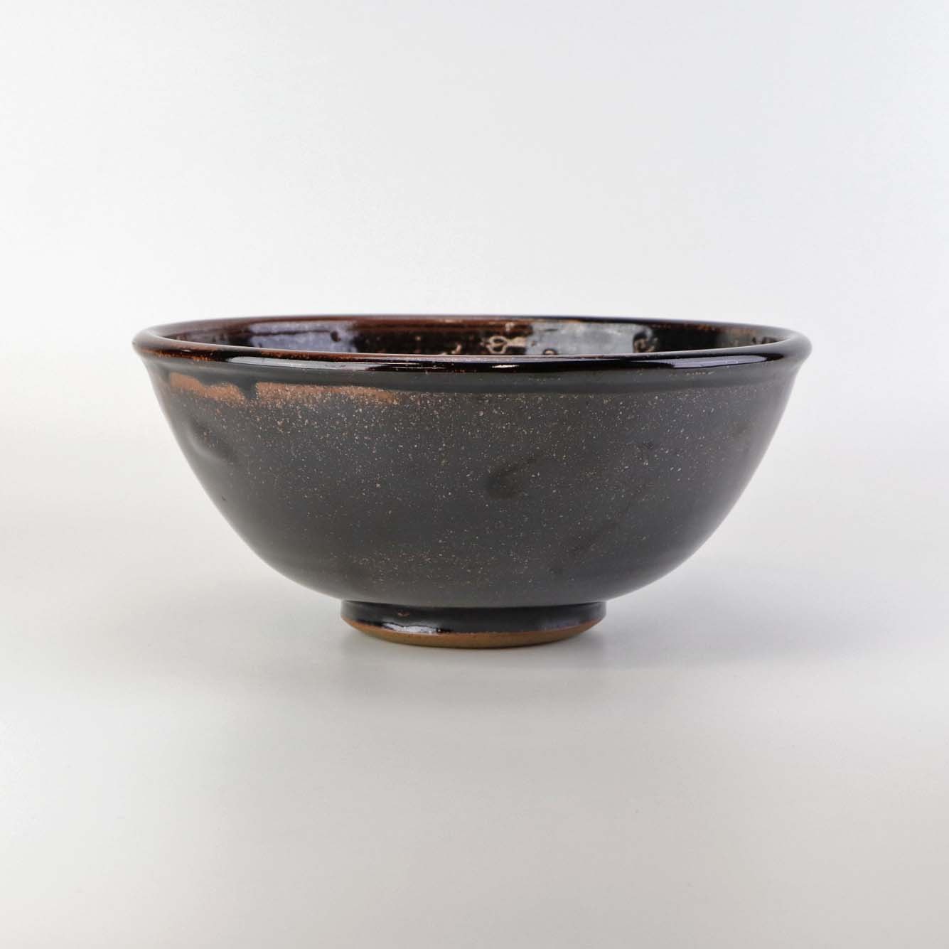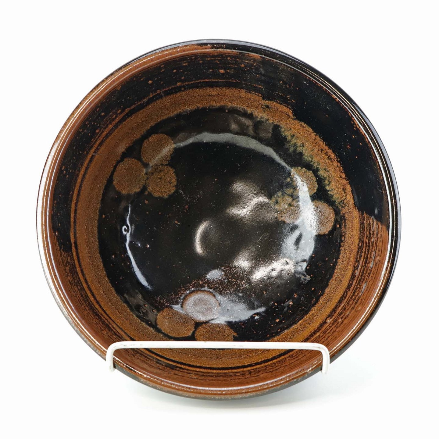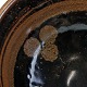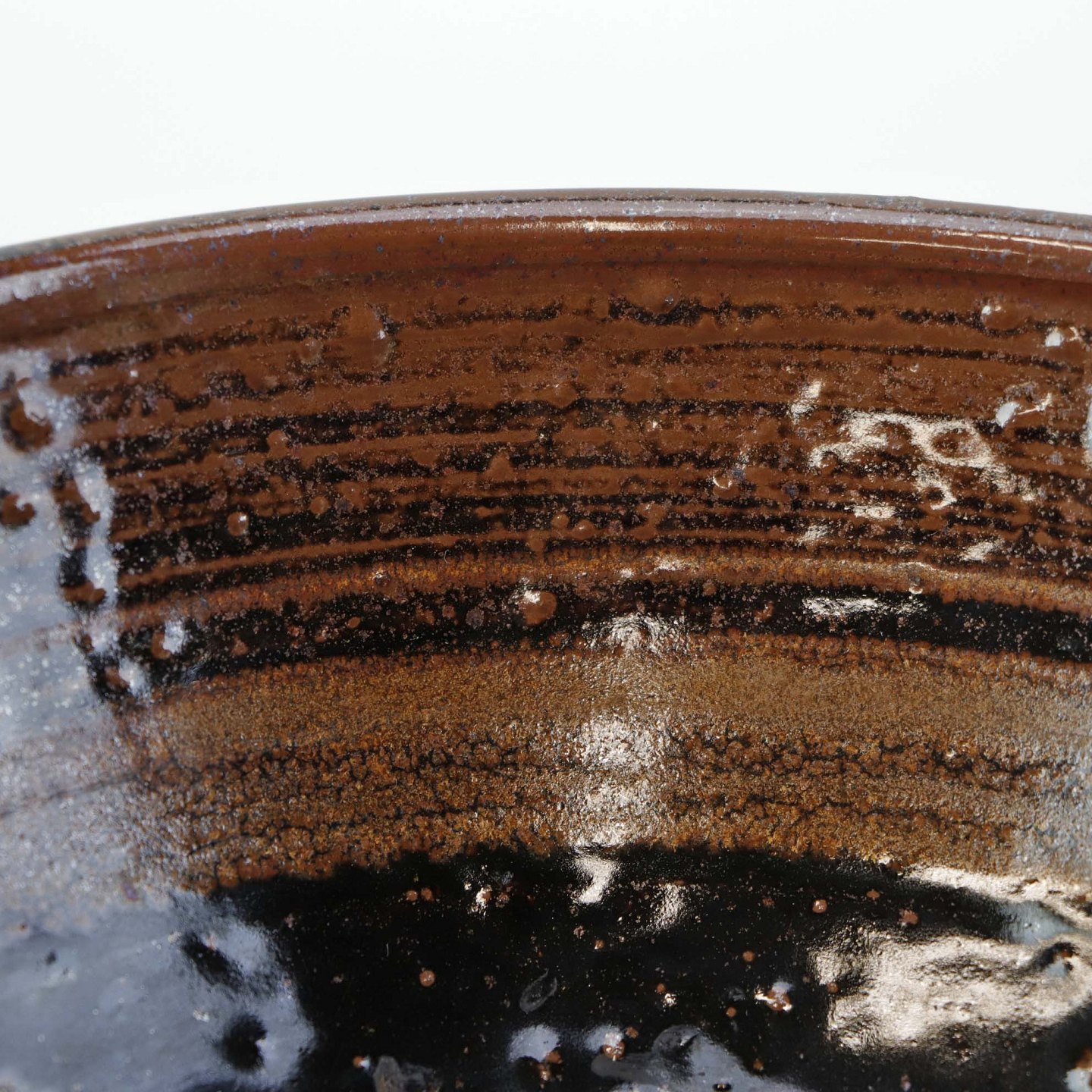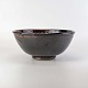 Beskrivelse: Skål i stentøj med delvist nubret glasur i brunlige nuancer og cirkelformet mønster i bunden.