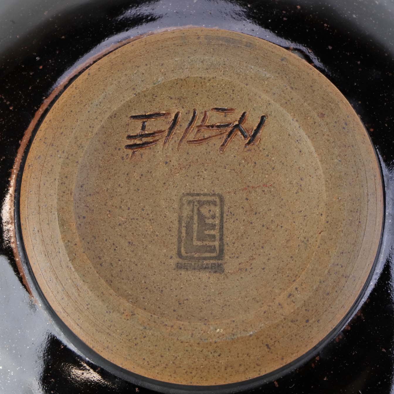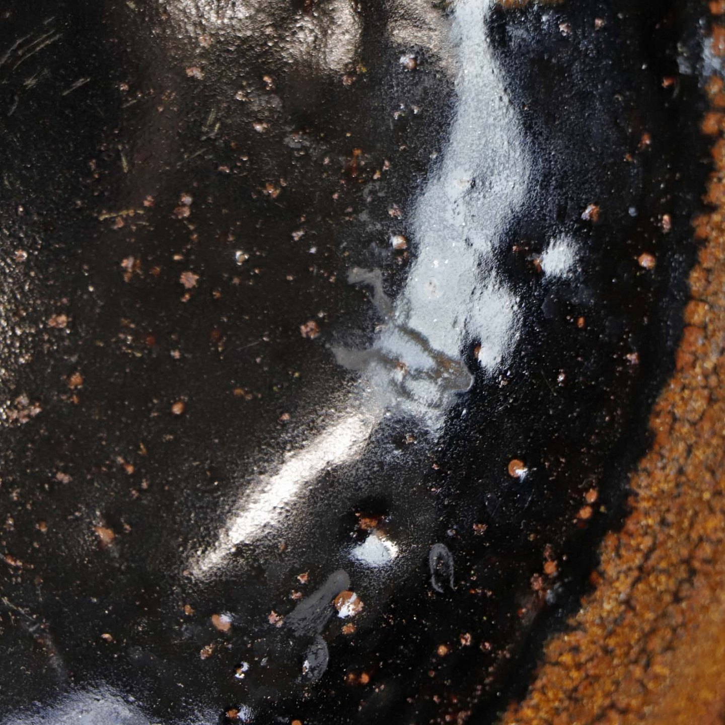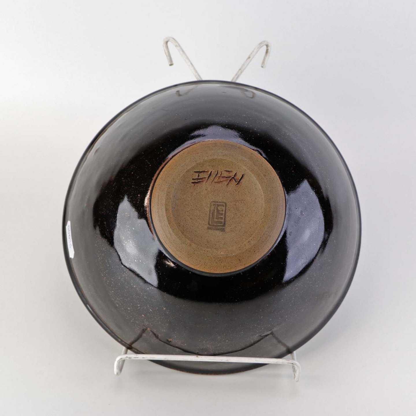 Beskrivelse: Skål i stentøj med delvist nubret glasur i brunlige nuancer og cirkelformet mønster i bunden.