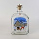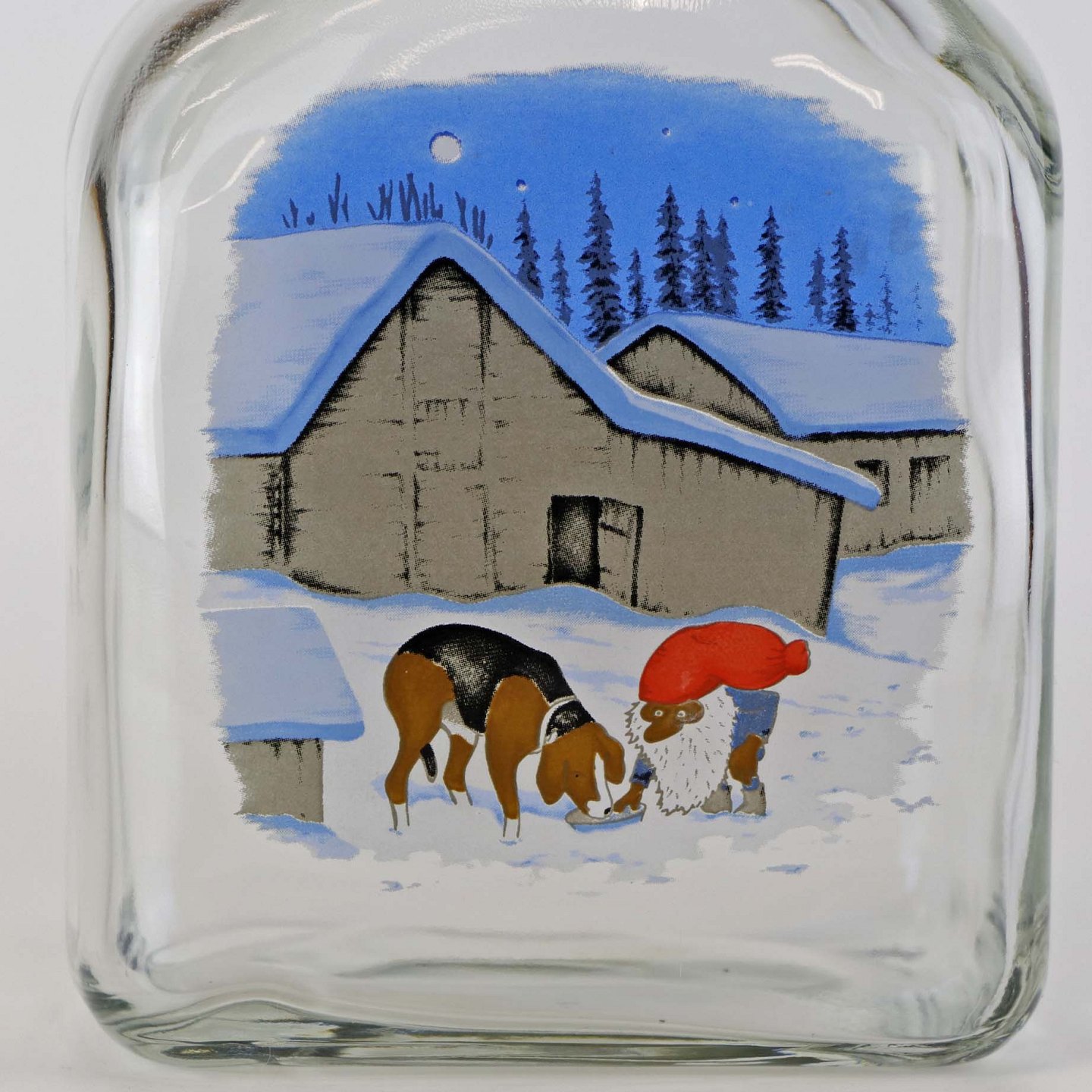Beskrivelse: Dramflaske i glas med julemotiv af Nisse, hund og ræv efter tegning af Harald Wibergs. Snapseflasken kommer med korkprop.