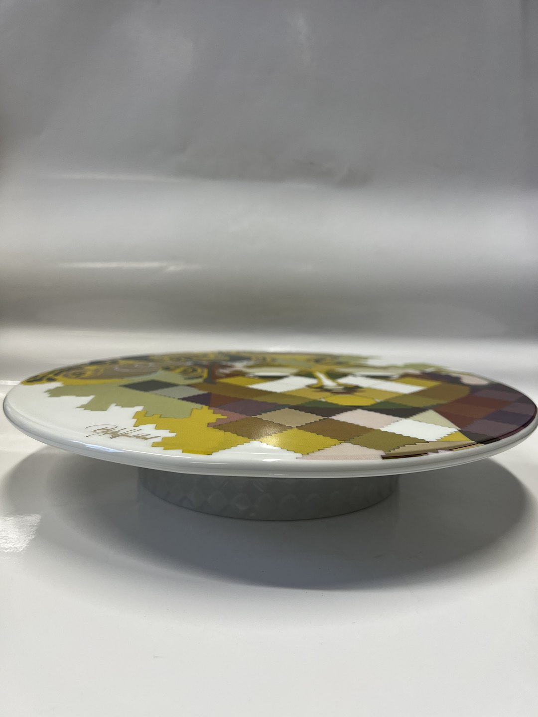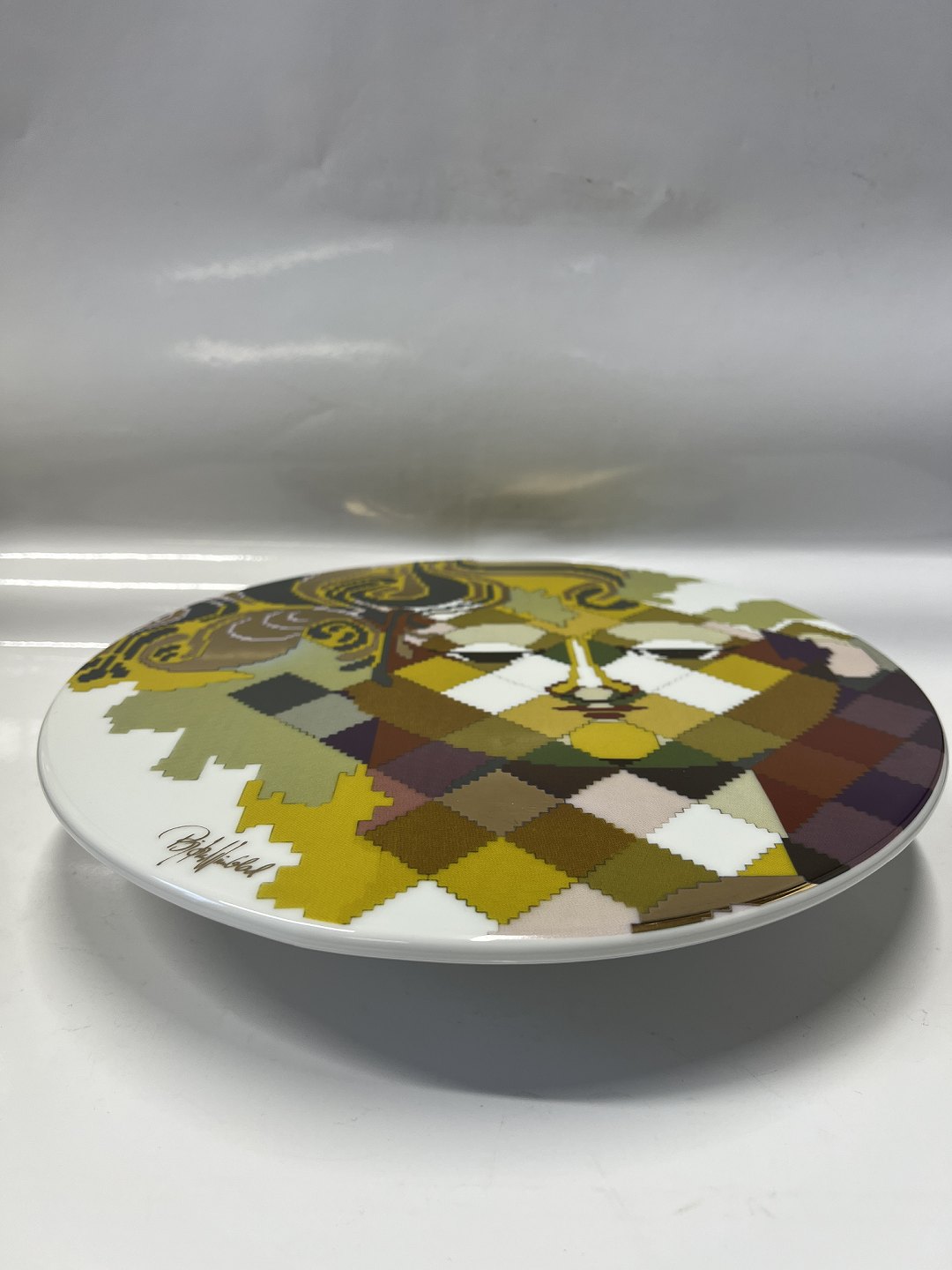 Beskrivelse: Dette smukke og tidløse kagefad, er et must have til det moderne køkken. Et smukt minimalistisk kagefad i ensartet hvid, med flot motiv på toppen. Motivet er en smuk mosaik af farver og figurer, der tilsammen giver det - for Bjørn Wiienblad - så karakteristiske ansigt med de smukke øjne. Foden er lavet med smukt rude-mønster, der giver fadet liv.