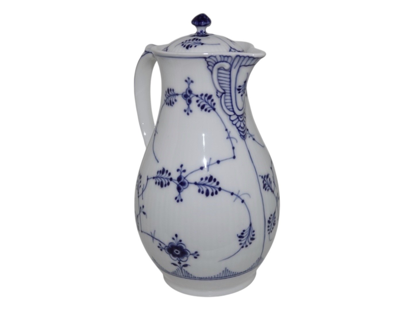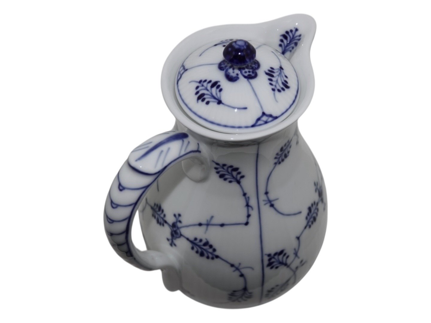 Beskrivelse: Royal Copenhagen Musselmalet Riflet, sjælden chokoladekande med tilhørende låg.