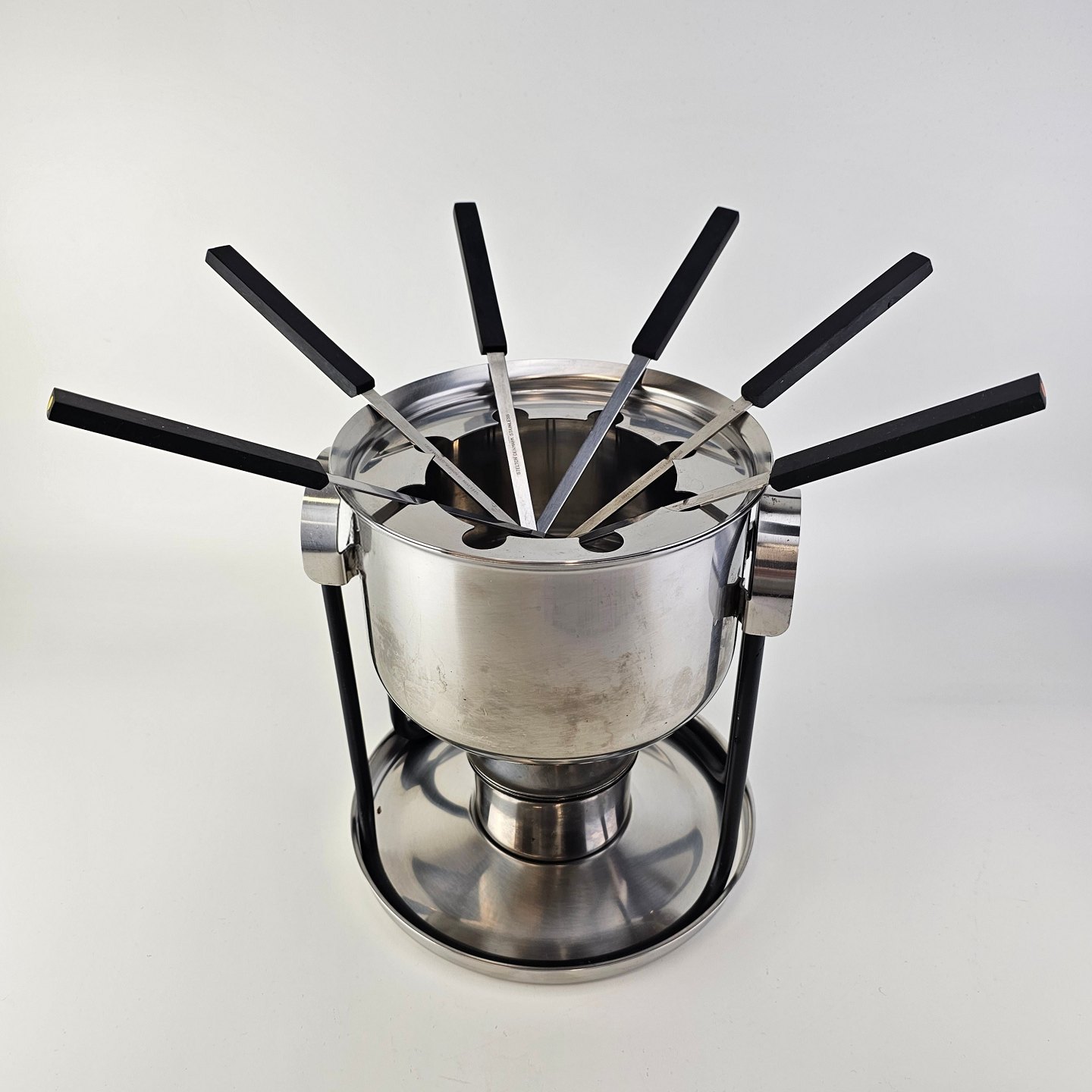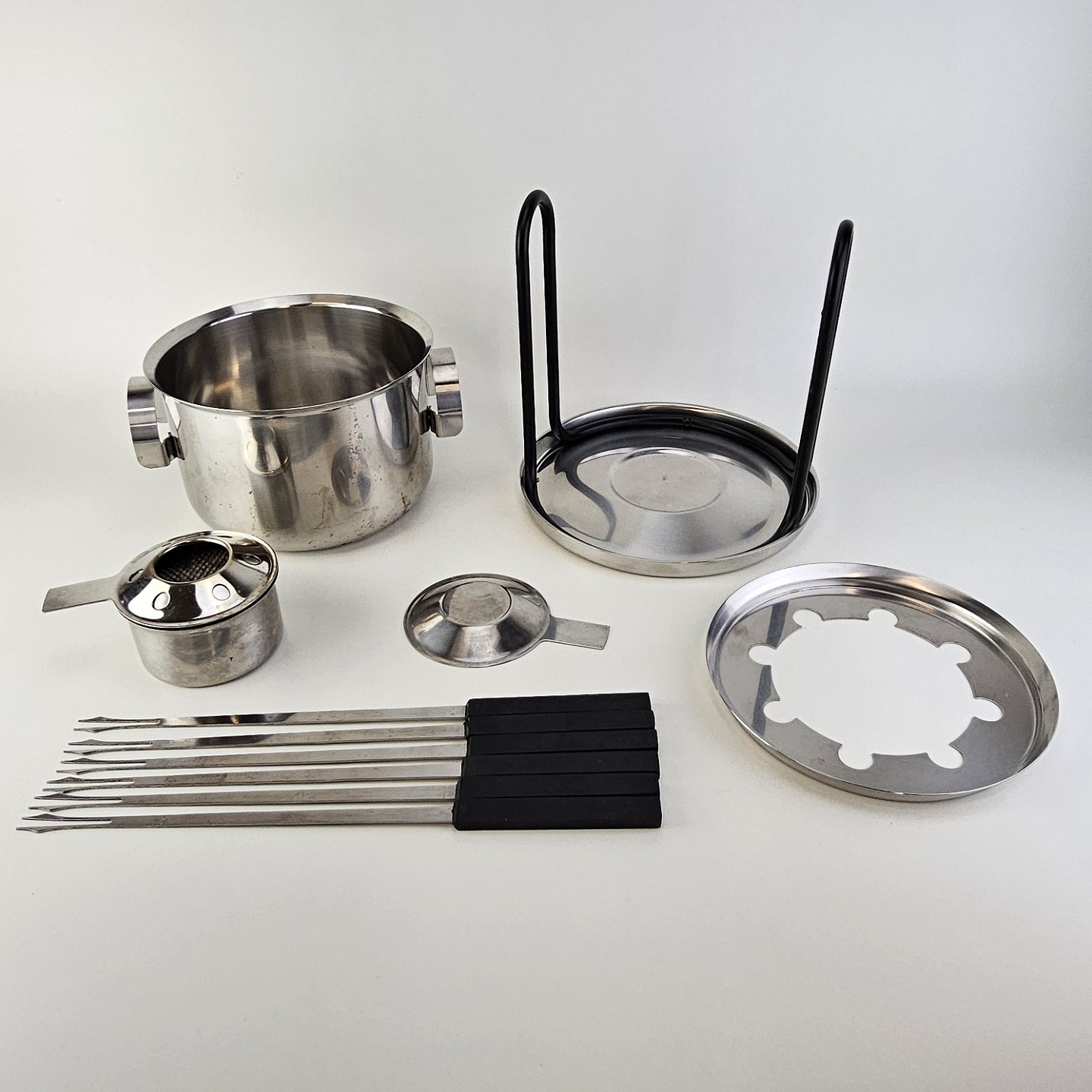 Beskrivelse: Stelton fonduesæt i rustfrit stål inklusiv stander, brænder, gryde og seks fondue gafler