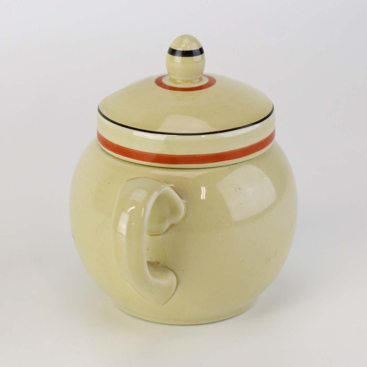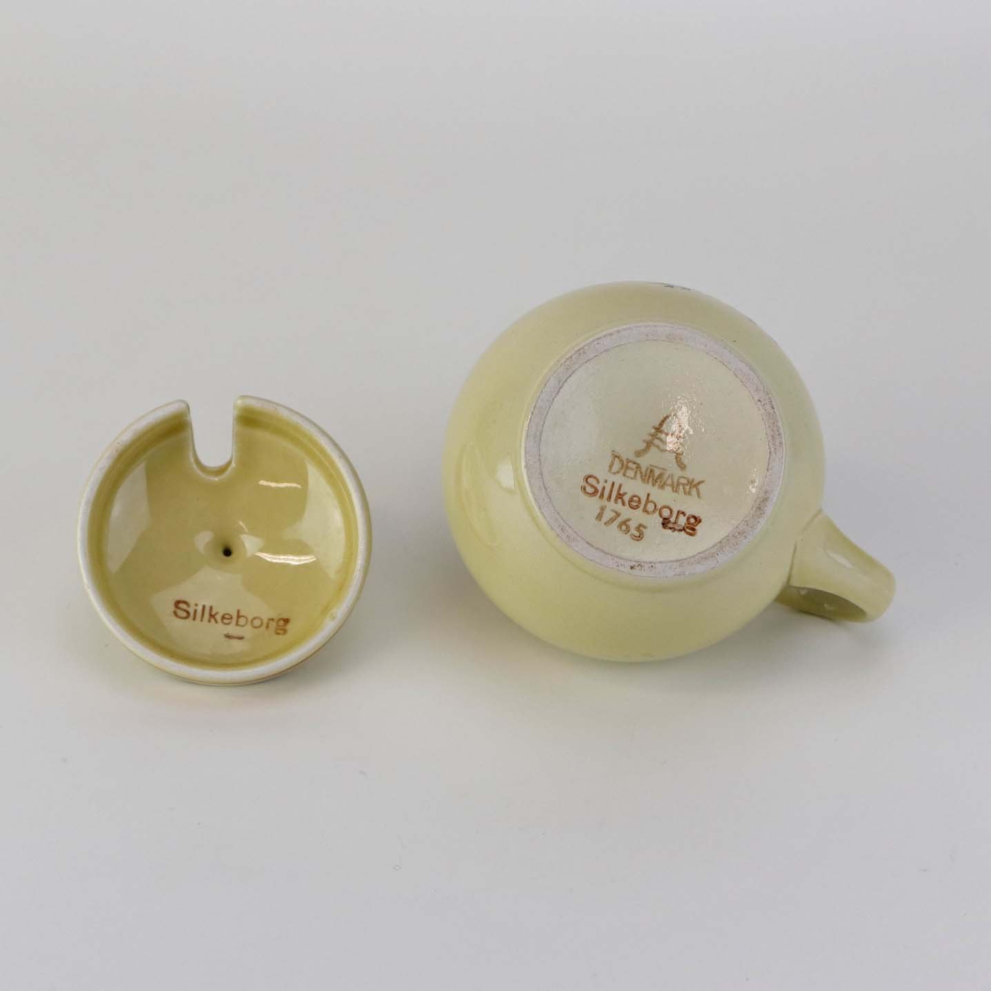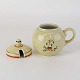 Beskrivelse: Kop med låg og hank til sennep i fajance fra stellet Silkeborg fremstillet i perioden 1937-1939. Nr. 1765