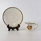 Fremstår med brugsspor på dekorationen, sorter nister og klakkeleringer i glasuren samt enkelte steder med bruneringer under glasuren på underkoppens bagside.