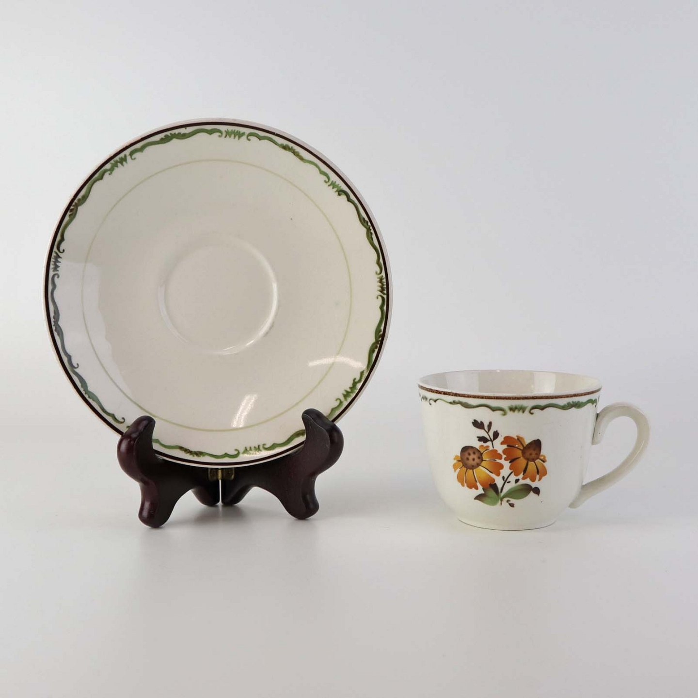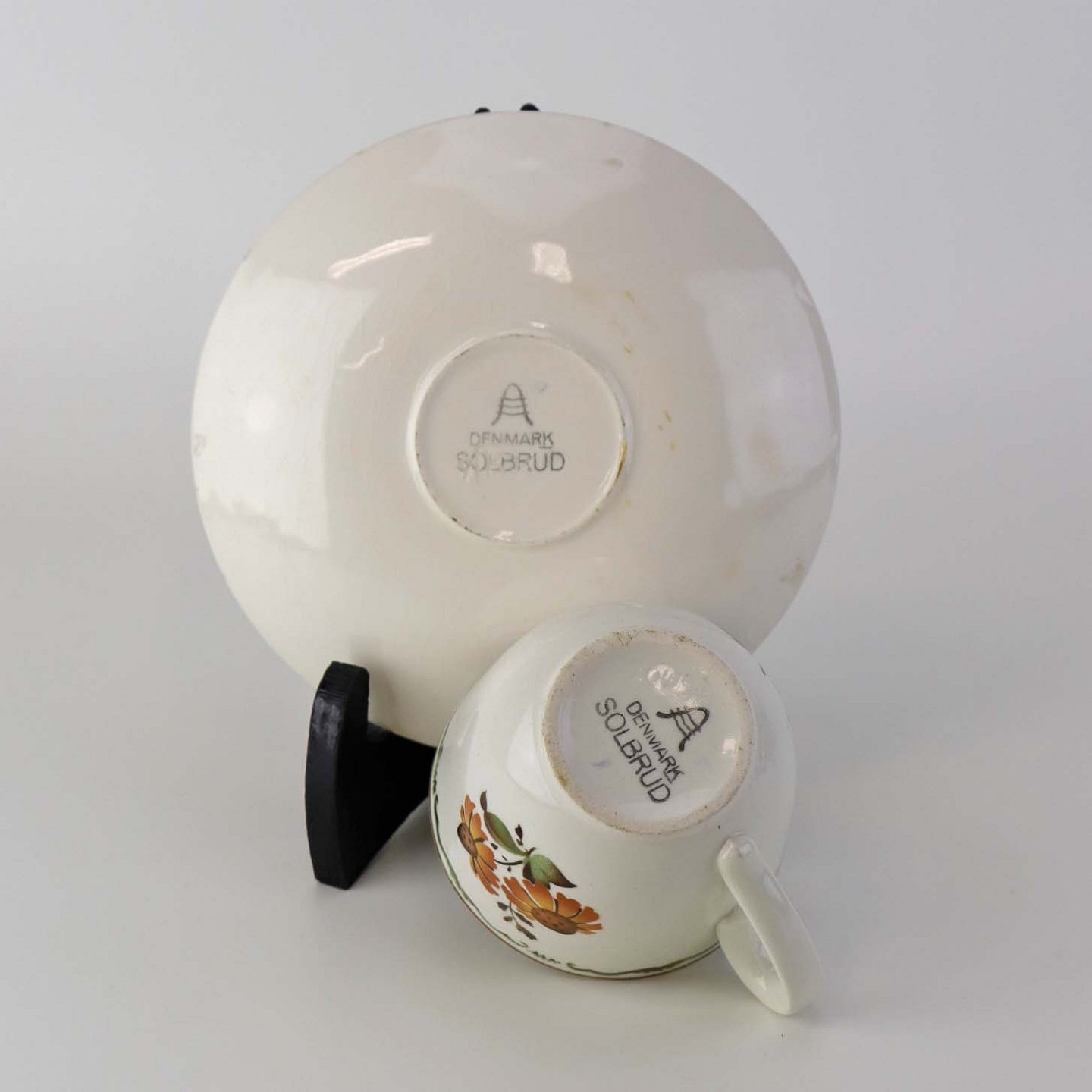 Beskrivelse: Kaffekop med underkop i fajance fra stellet Solbrud fremstillet i perioden 1937-1967. Nr. 2049