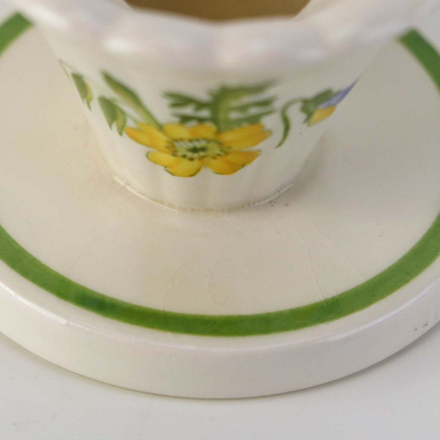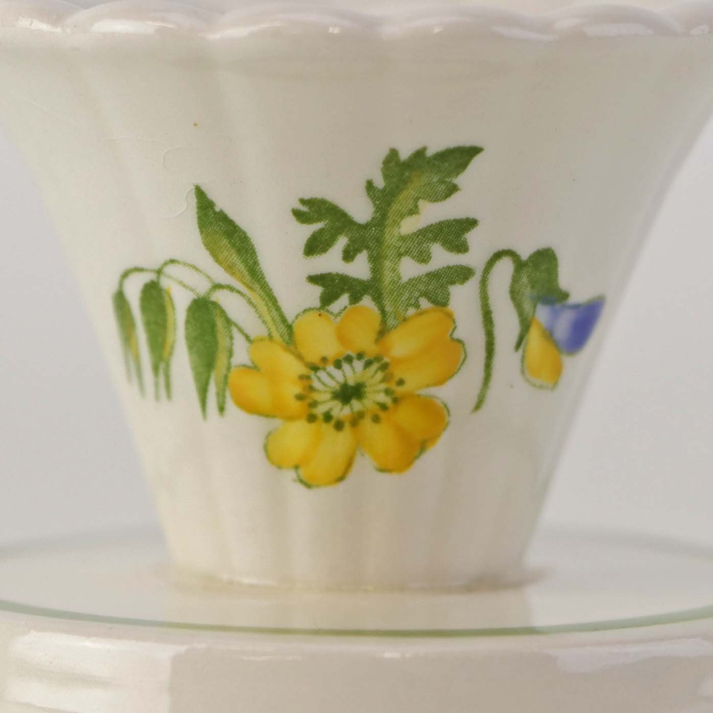 Fajancestellet er fremstillet i i stelformen Dorrit med dekoration af vilde blomster på cremefarvet baggrund med grøn kant.