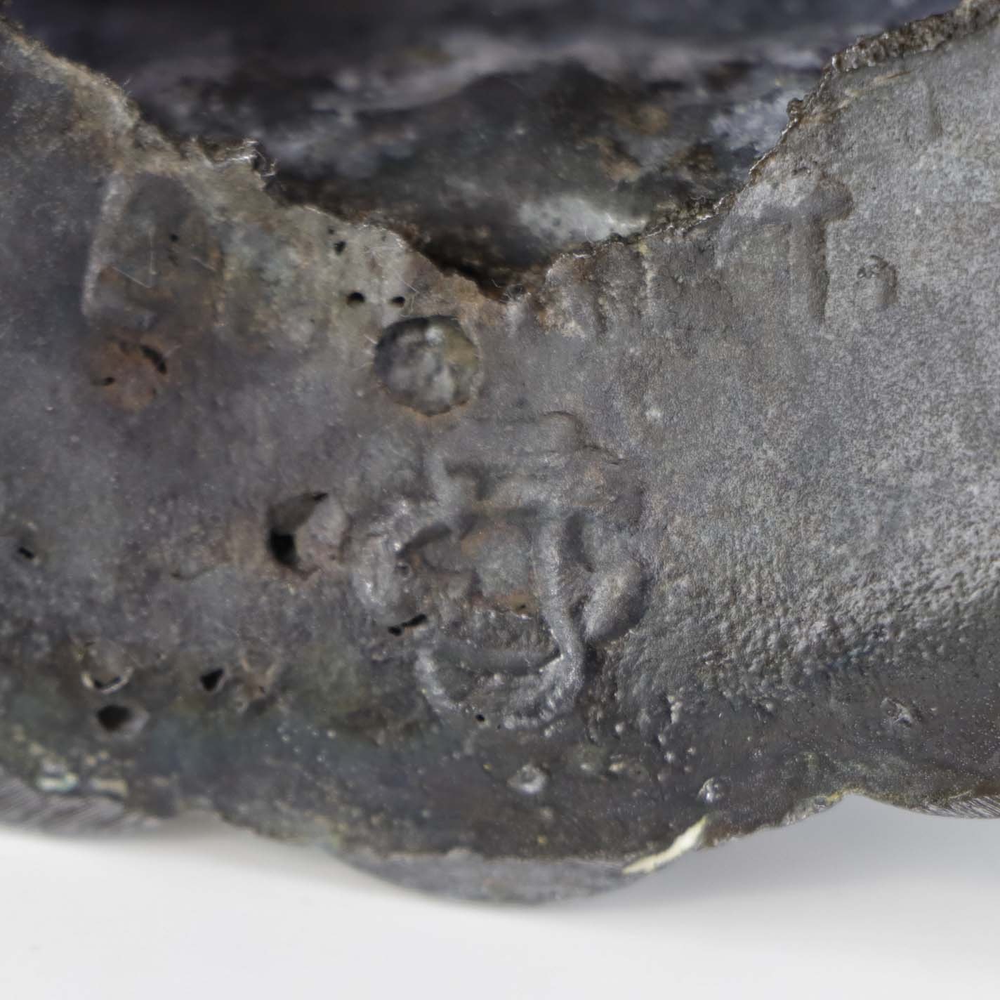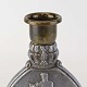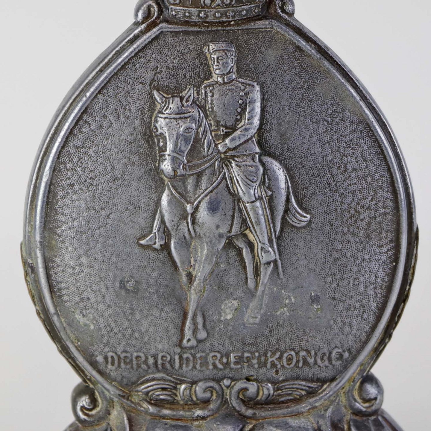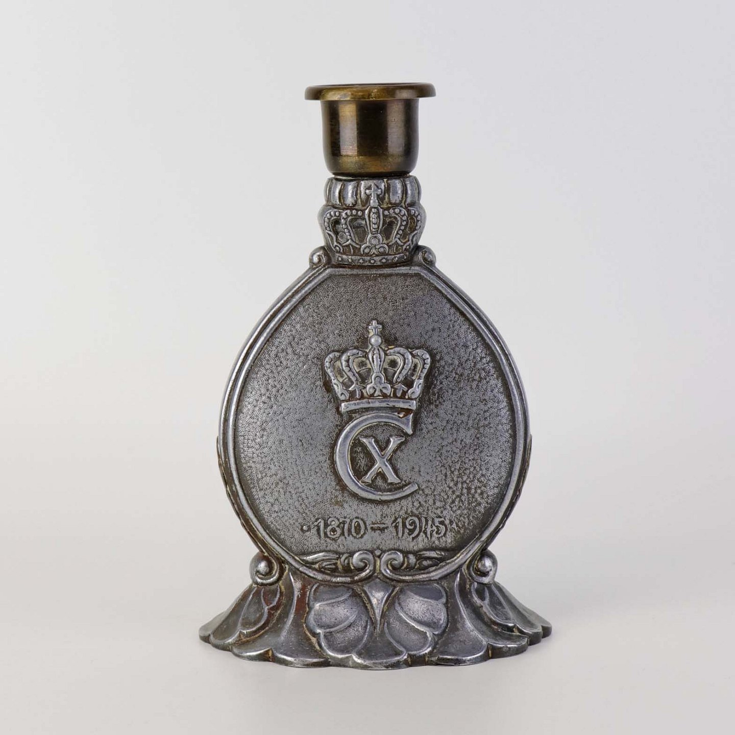 Beskrivelse: Lysestage i tin med messing dekoration og top med motiv af Kong Christian den 10. til hest med teksten 'Der rider en konge' og '1870-1945'