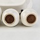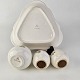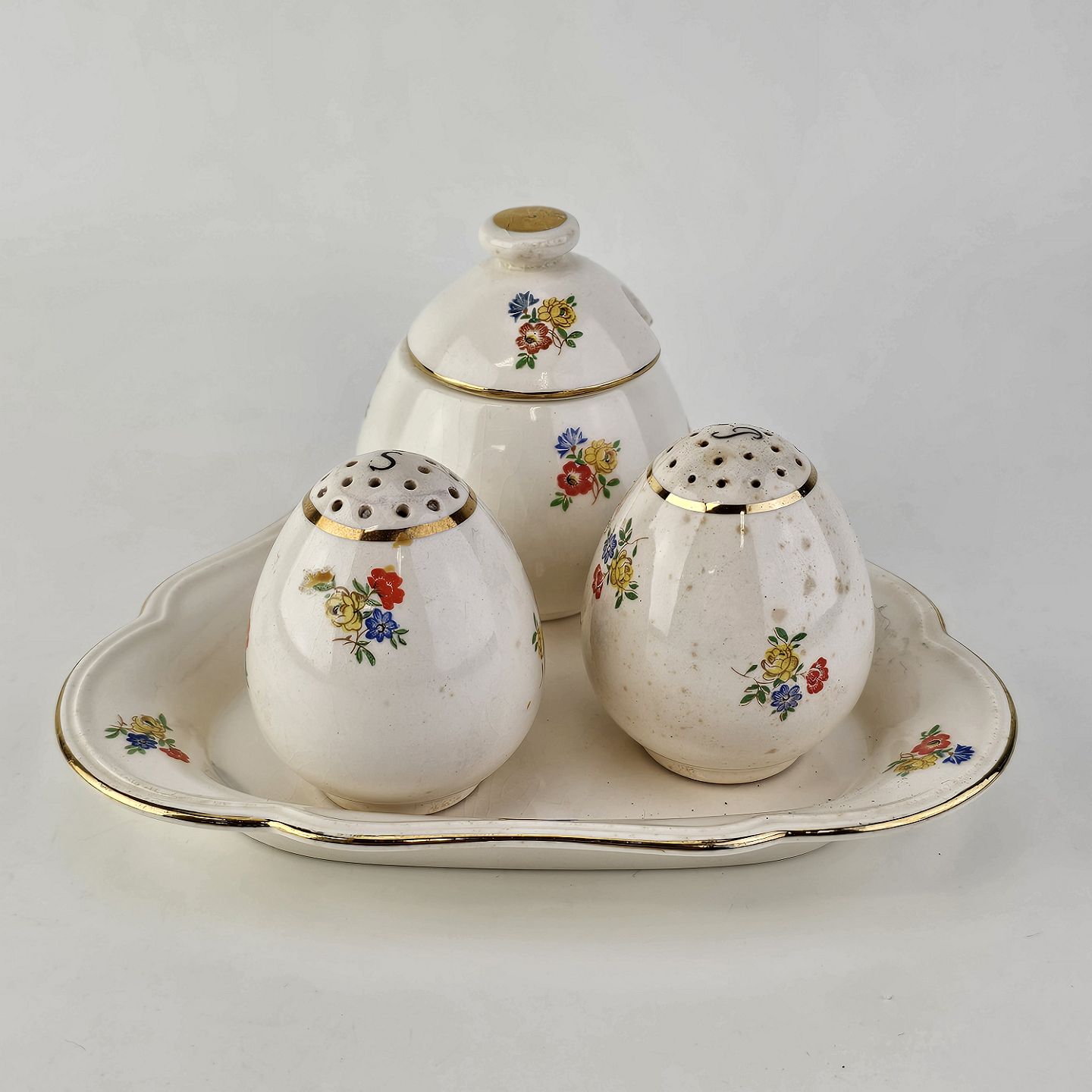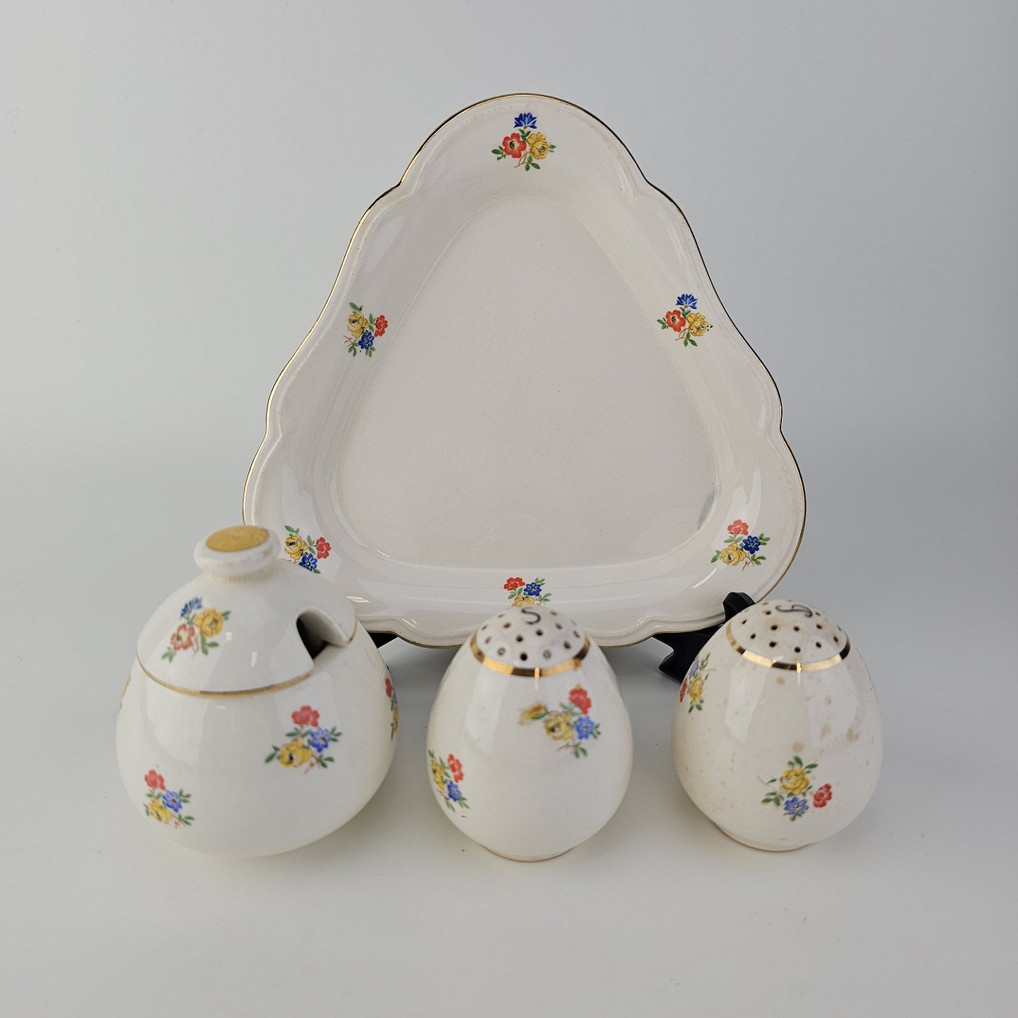 Beskrivelse: Trekantet fad med sennepskrukke, saltbøsse og peberbøsse i fajance fra stellet Anna Sofie