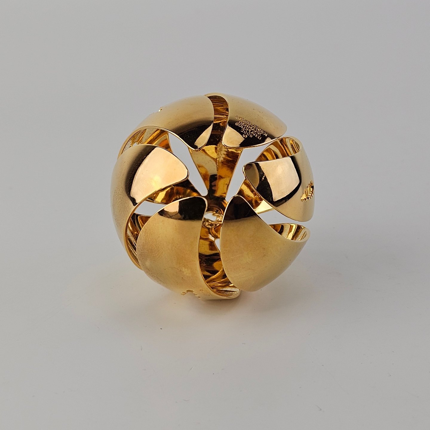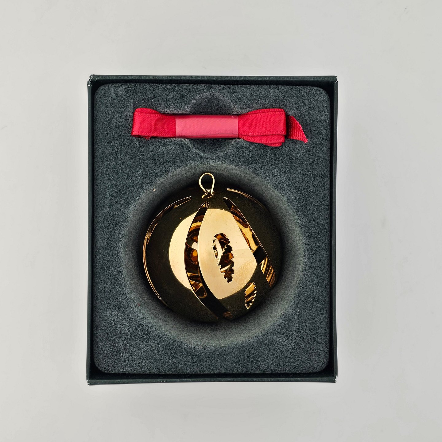 Beskrivelse: Julekugle med granmotiv 2005 i messing forgyldt med 24 karat guld fra serien Christmas Classics
