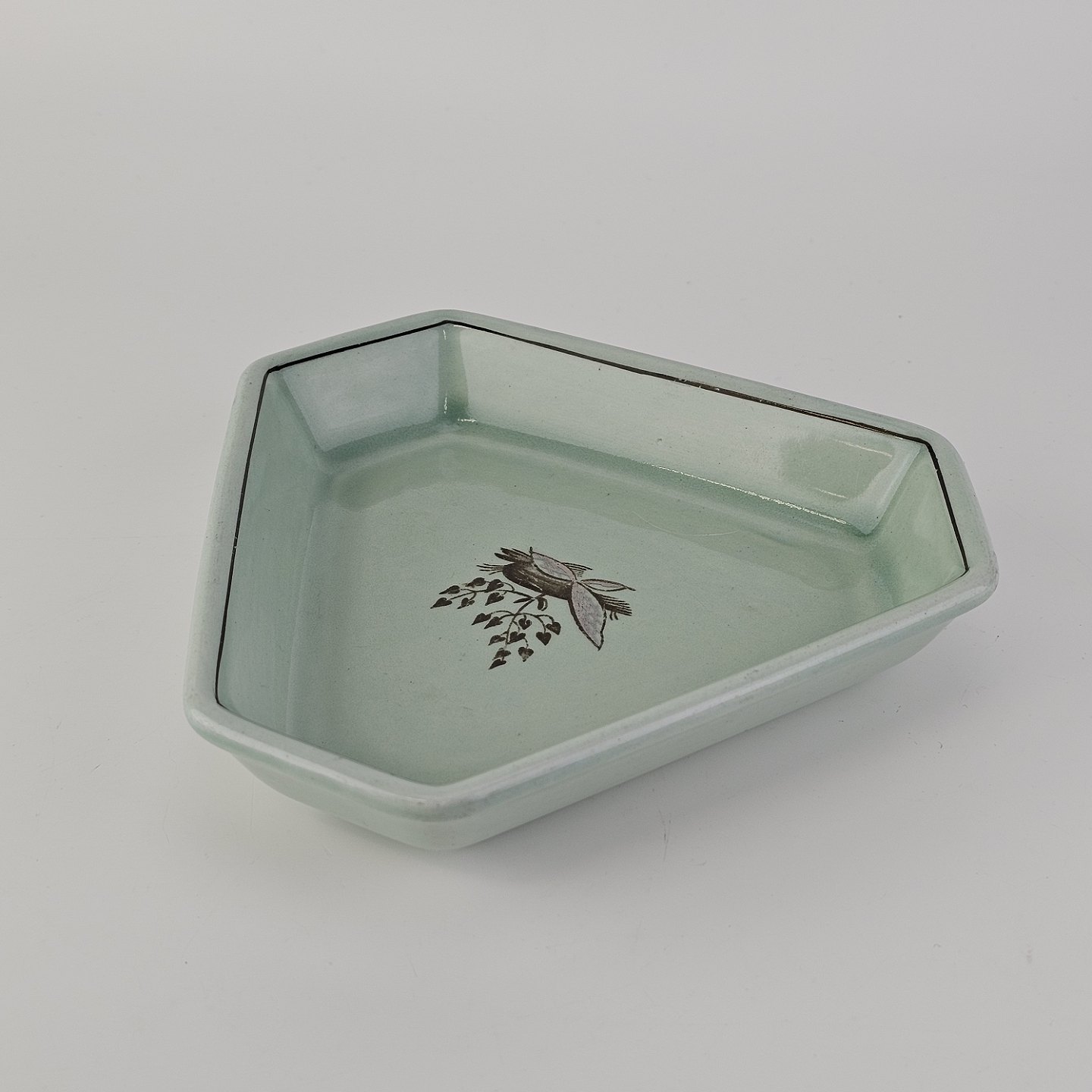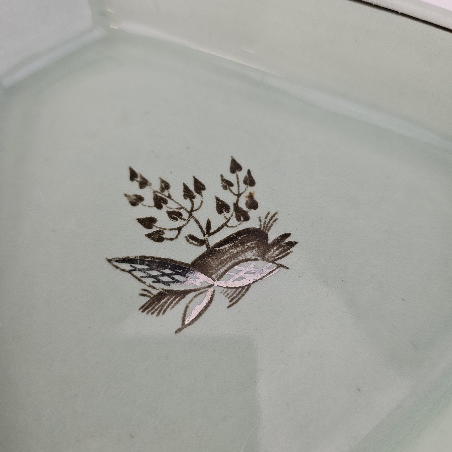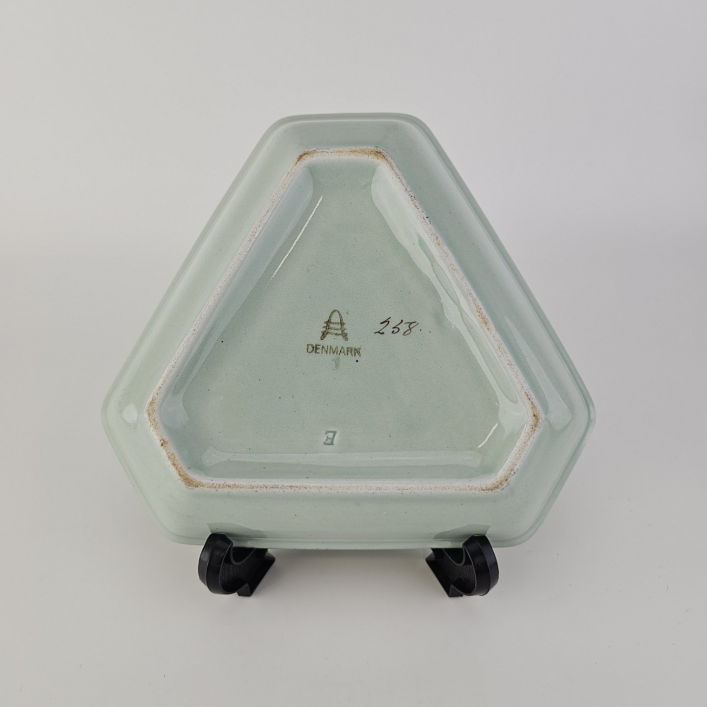 Beskrivelse: Plat de menage fad til salt, peber og sennep i fajance fra stellet Saltholm