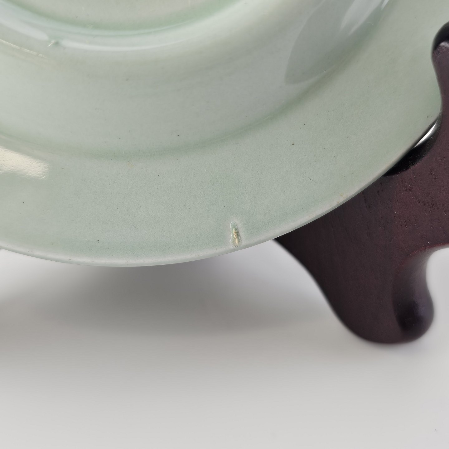 Stel i lysegrøn fajance med natur dekoration og flettet kant