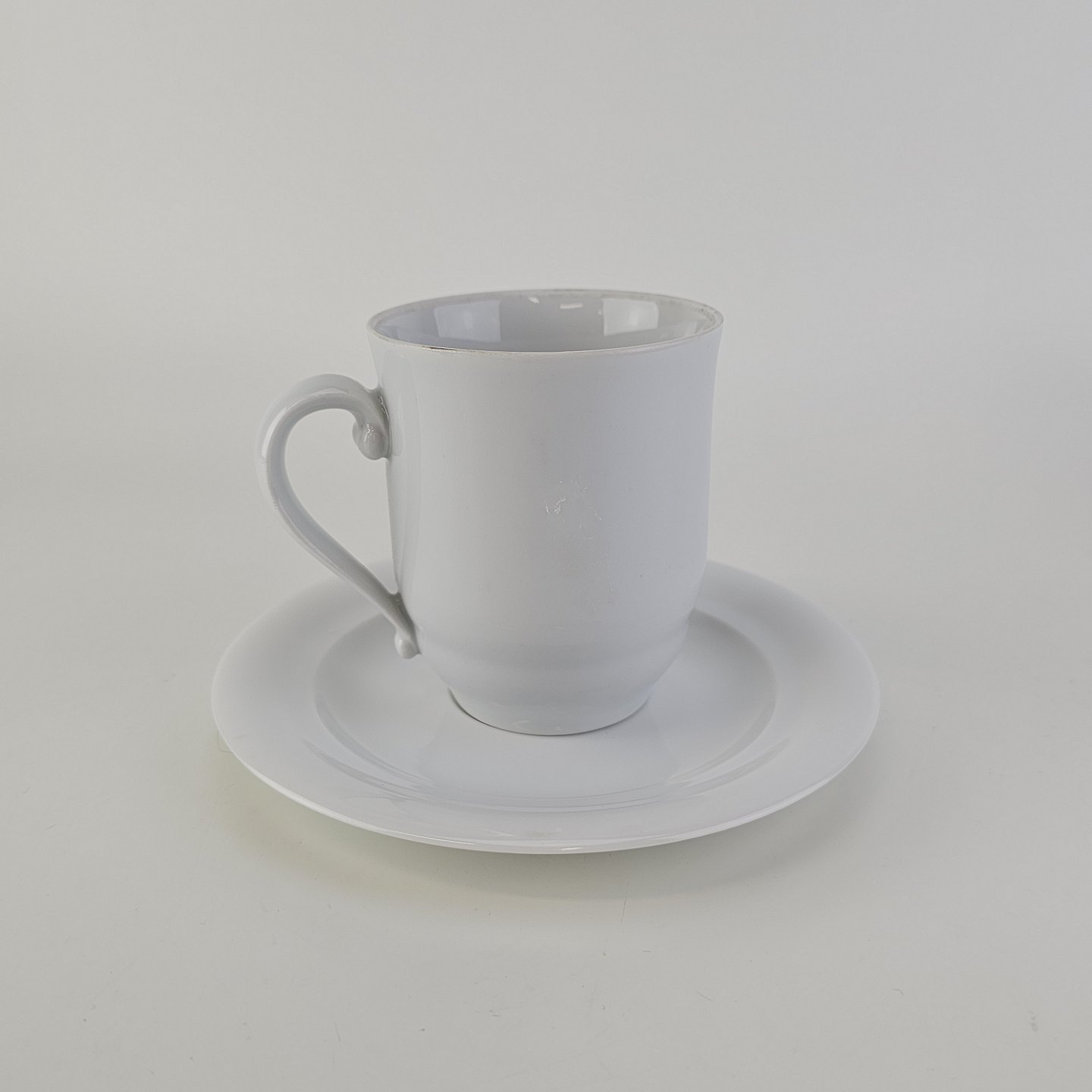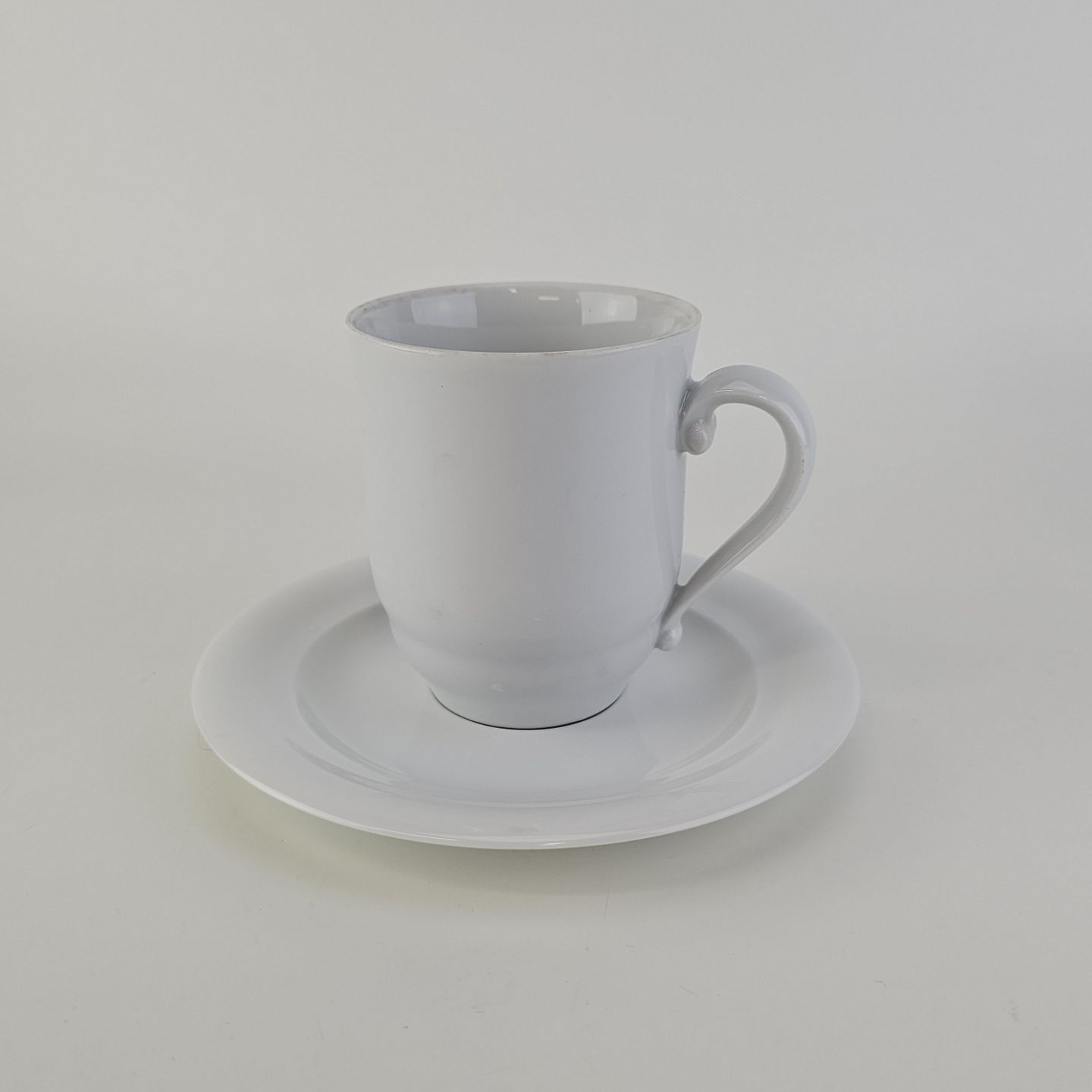 Beskrivelse: Høj kop med underkop i hvidt kongeligt porcelæn