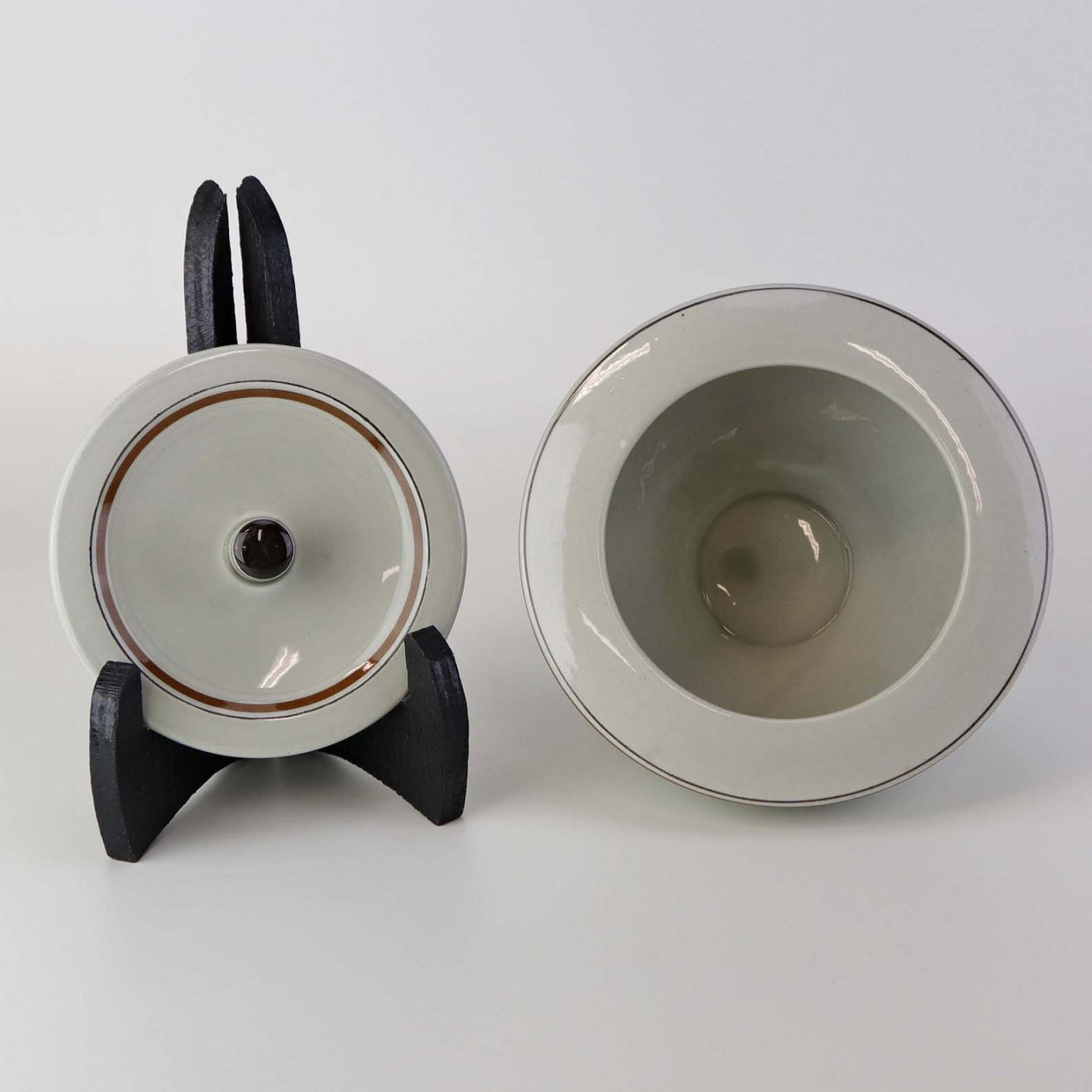 Beskrivelse: Lågskål til sukker i fajance fra stellet Kirsten, som blev fremstillet i perioden 1934-1957. Nr. 263